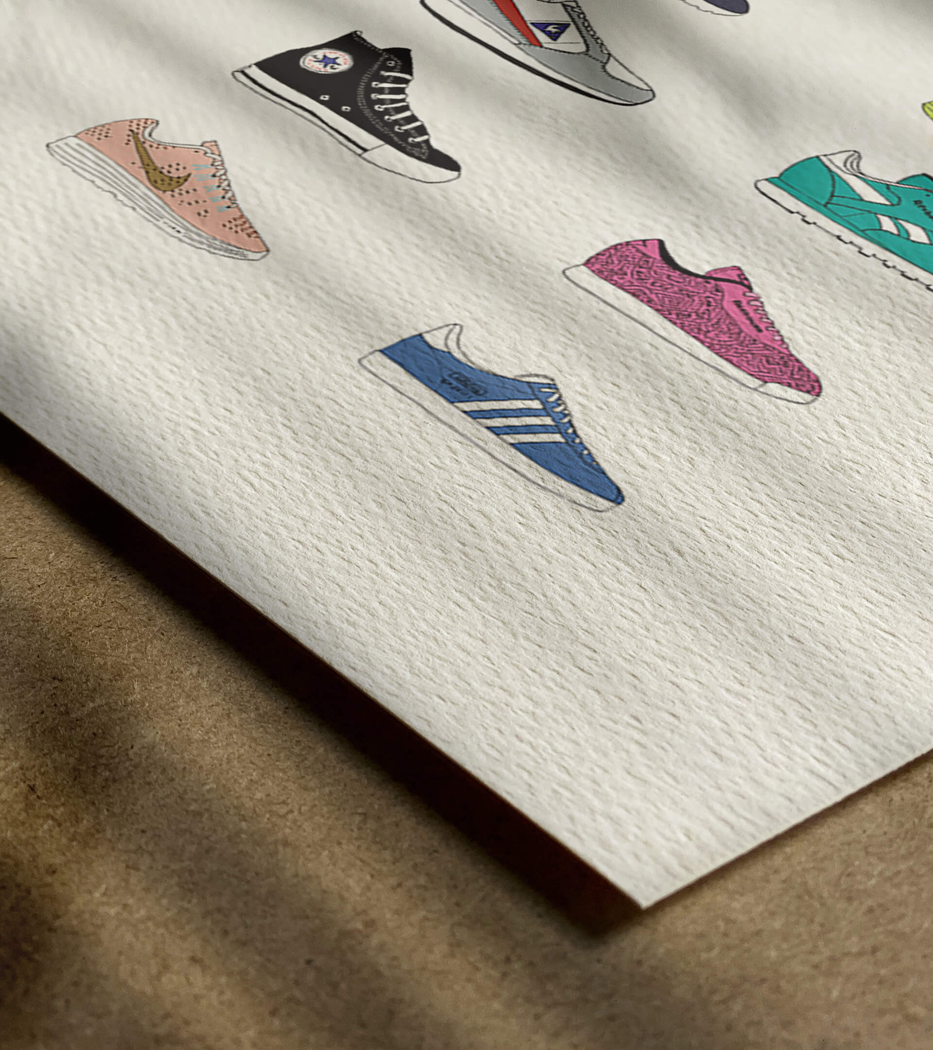 Dessinée à 4 mains, l’affiche « »Baskets » », est une représentation, non exhaustive, bien sûr, de sneakers iconiques. Les marques bien connues y sont illustrées, tant pour les petits que pour les grands.