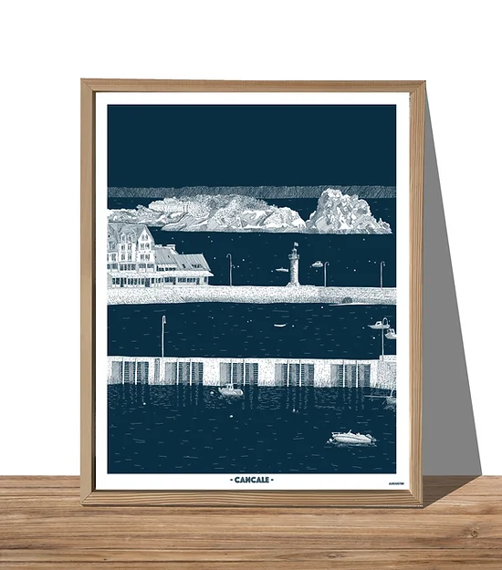 Reproduction d’un dessin réalisé à la main. Une affiche qui illustre Cancale, une ville côtière bretonne connue pour ses huîtres.