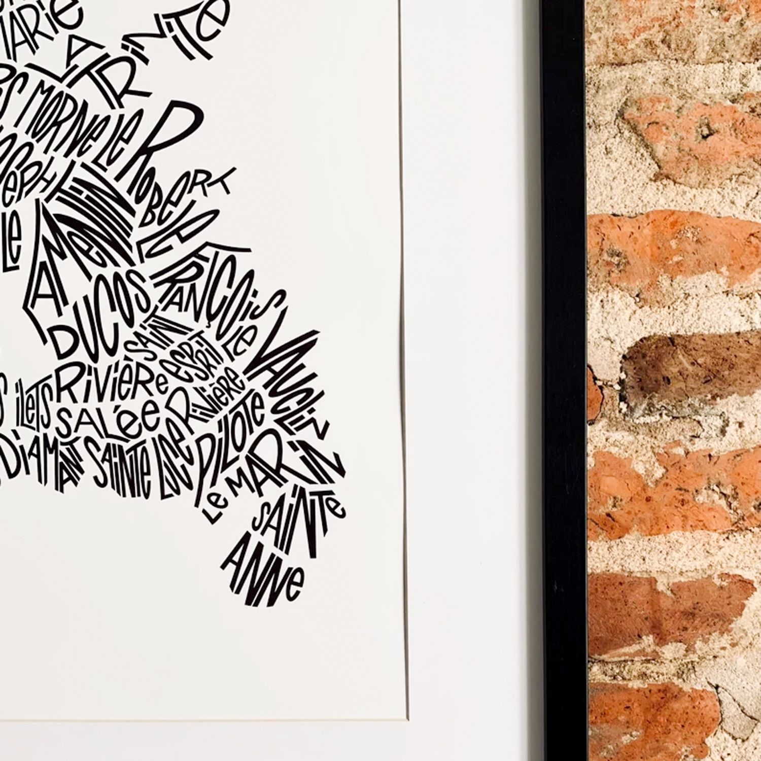 L’affiche Martinique, conçue par les petits plans, illustre la Martinique en utilisant les noms des villes comme Basse-Pointe, Bellefontaine, Case-Pilote, Ducos, Fonds-Saint-Denis, Fort-de-France, Grand’Rivière, Grand-Morne, L’Ajoupa-Bouillon… disposés selon leur position géographique. Ces noms de villes se combinent pour former la Martinique. Chaque affiche est crééé à la main avec de l’encre de Chine.
