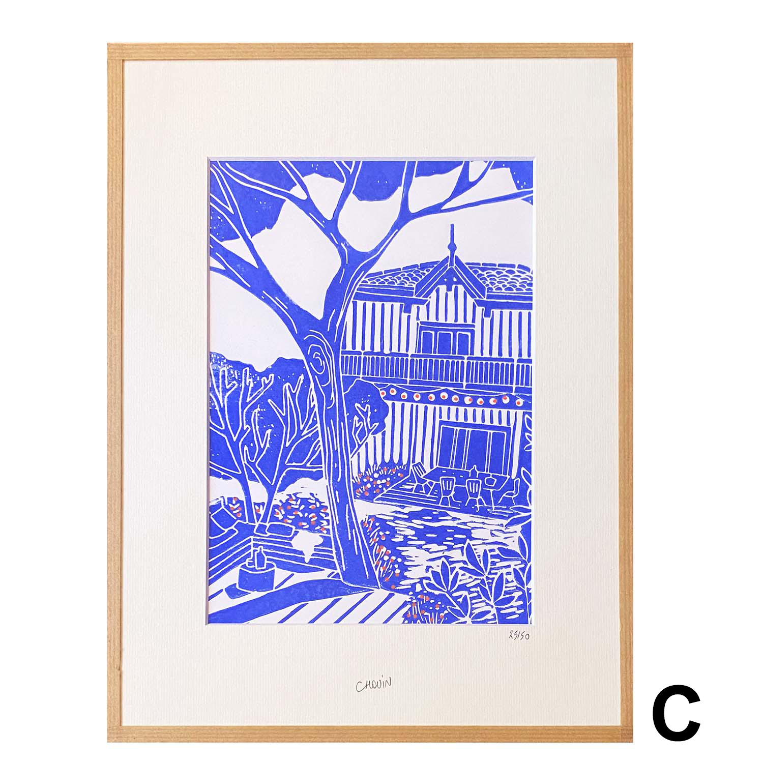 Chaque modèle est produit en 50 exemplaires, réalisés, numérotés et signées à la main. Les détails en oranges sont ajoutés à main levée après pressage manuel et peuvent différer légèrement d’un exemplaire à l’autre. La linogravure est encadrée avec du kraft.