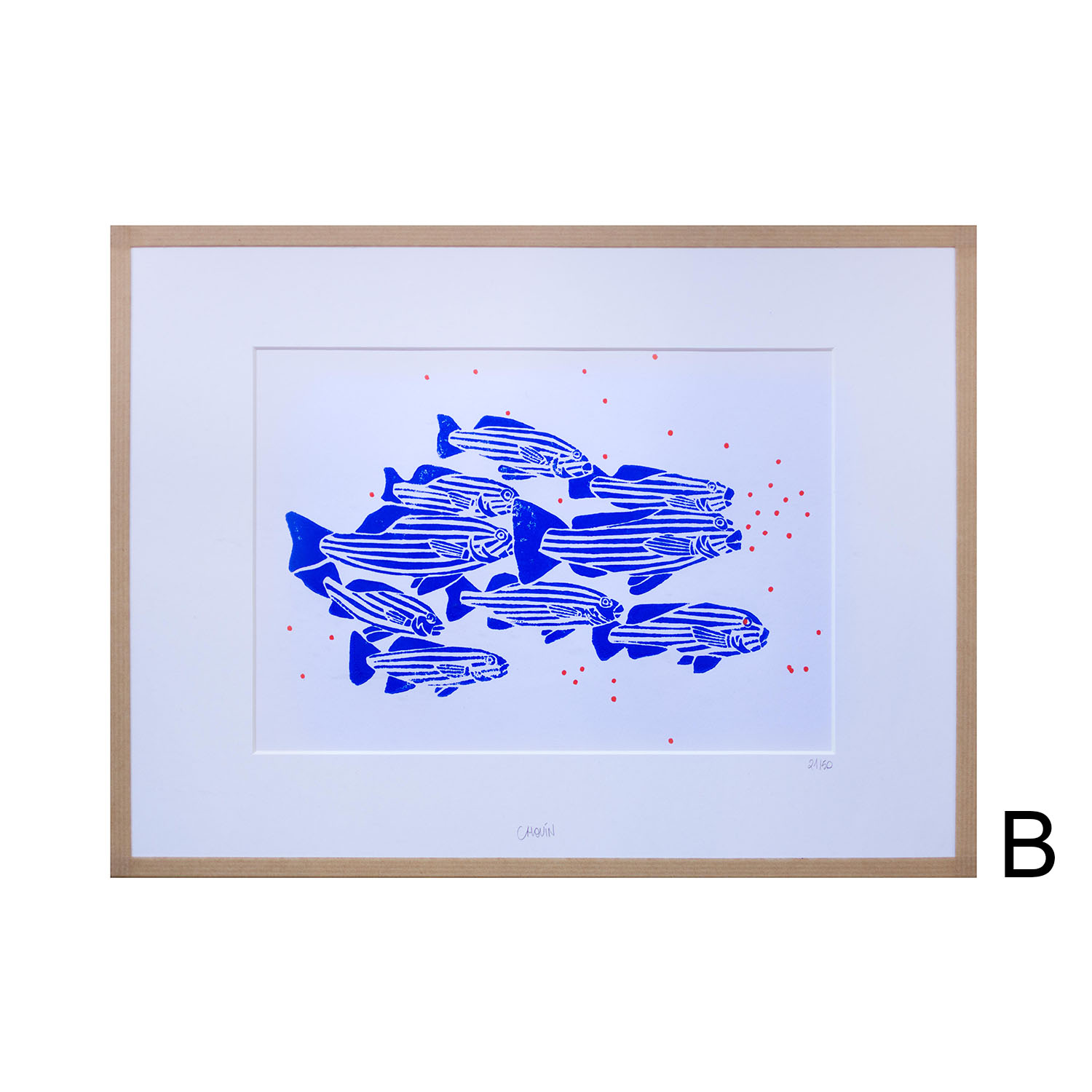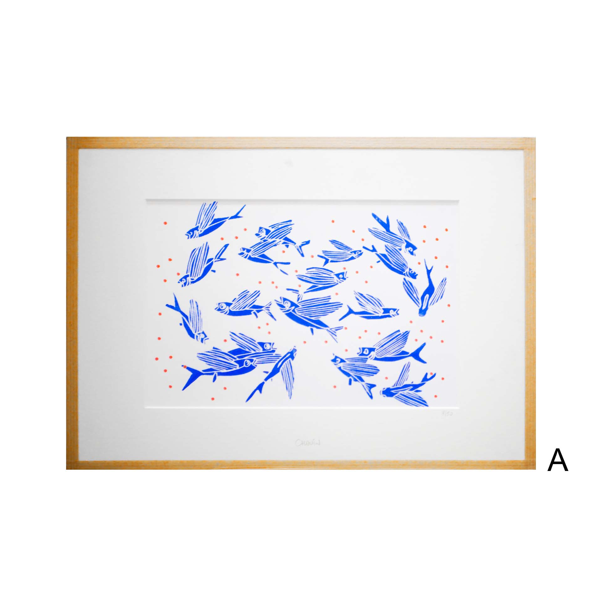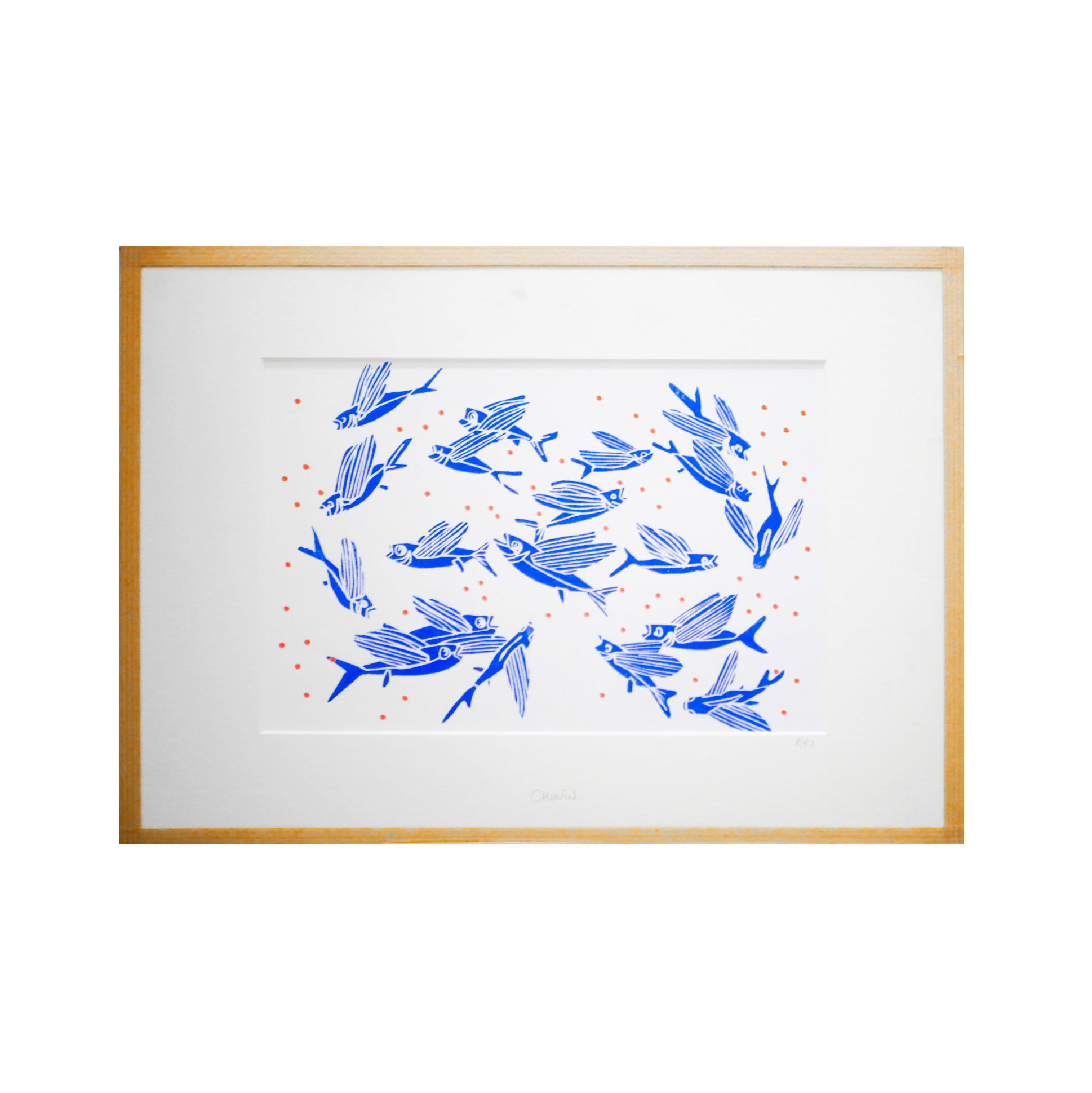 La linogravure Morgane Chouin ‘Les Poissons’ du thème des Animaux Marins est produite en 50 exemplaires, numérotée et signée à la main. Les détails en oranges sont ajoutés à la main. La linogravure est encadrée avec du kraft.