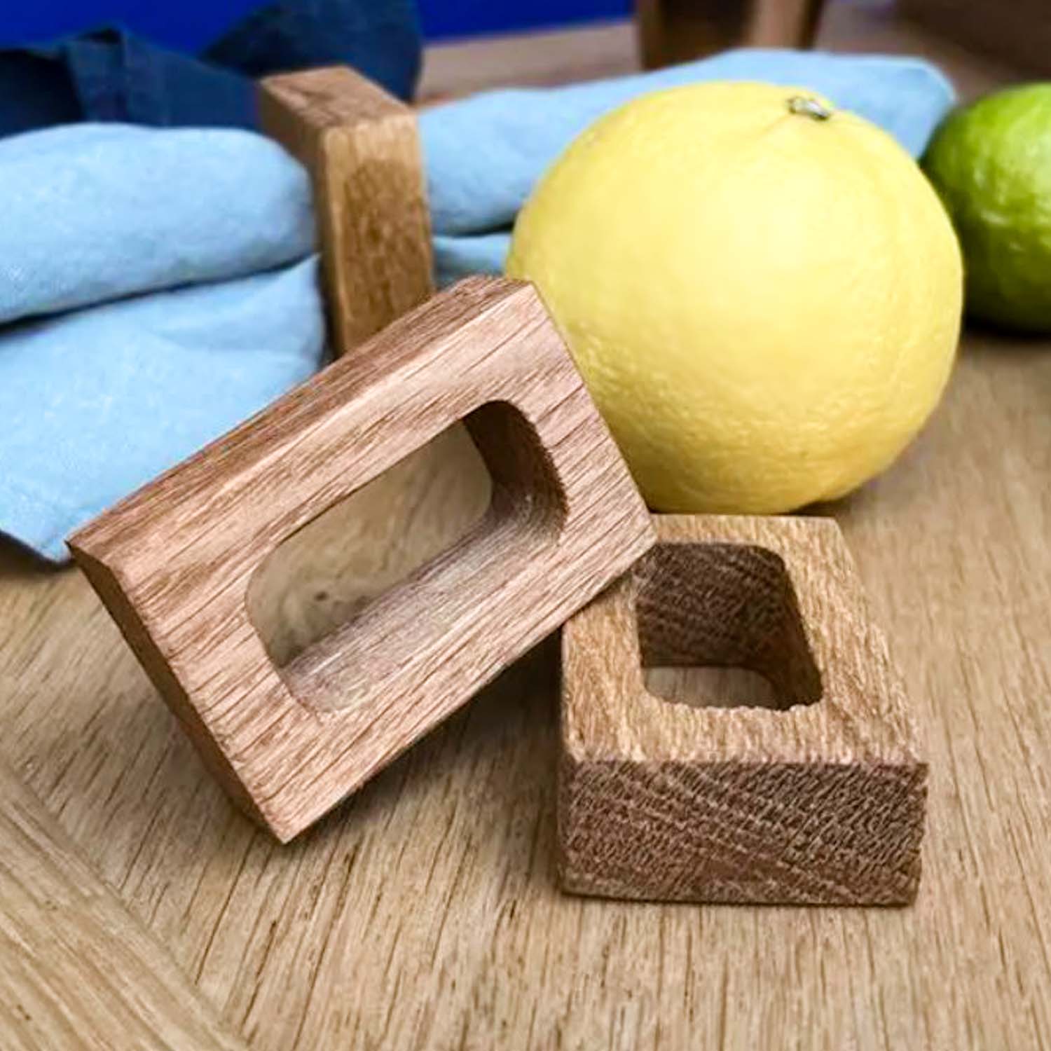 Lot de ronds de serviette de forme rectangulaire. Ces accessoires de table sont fabriqués en bois de chêne massif issu de chutes récupérées lors de la fabrication de mobilier.