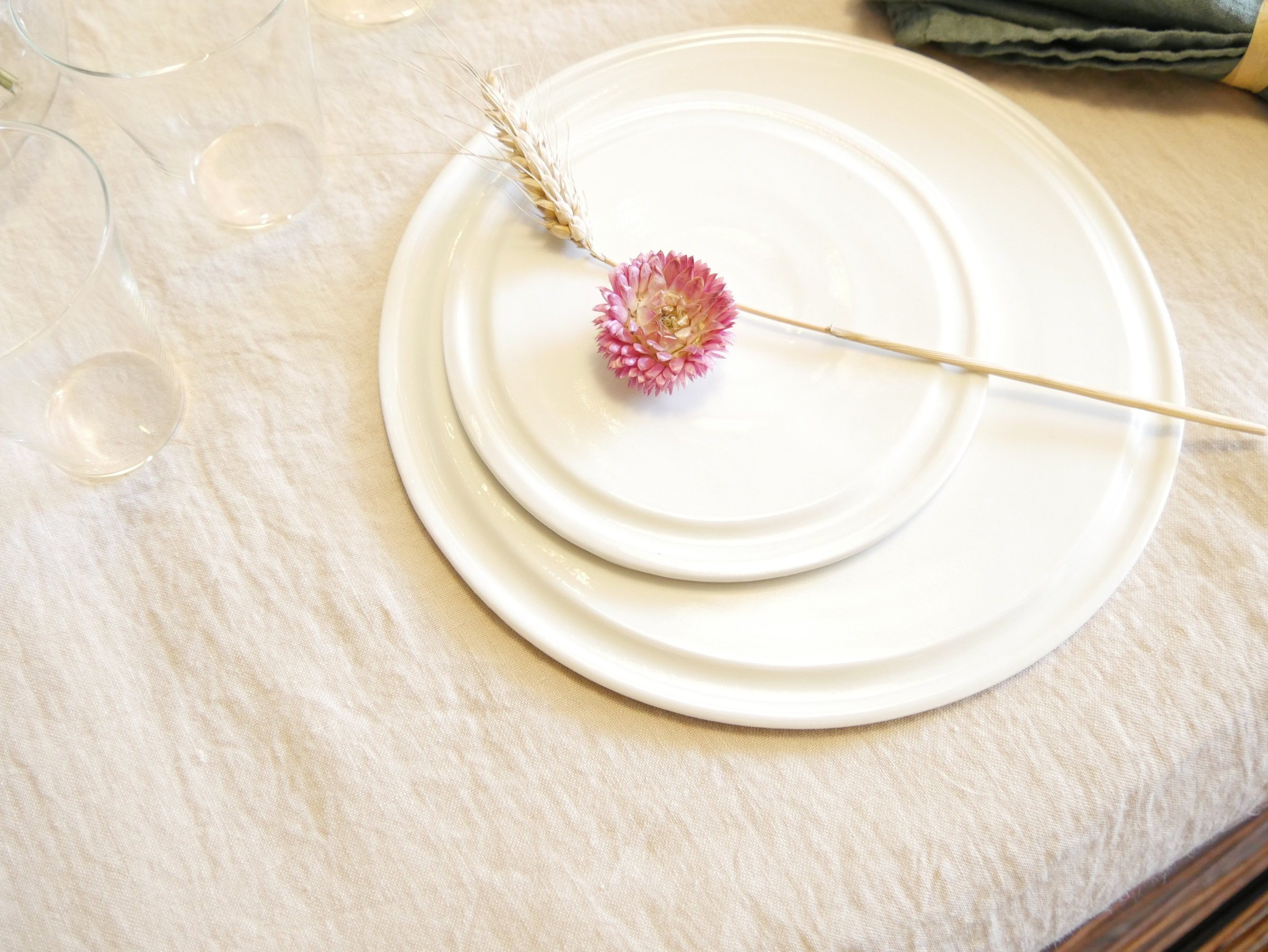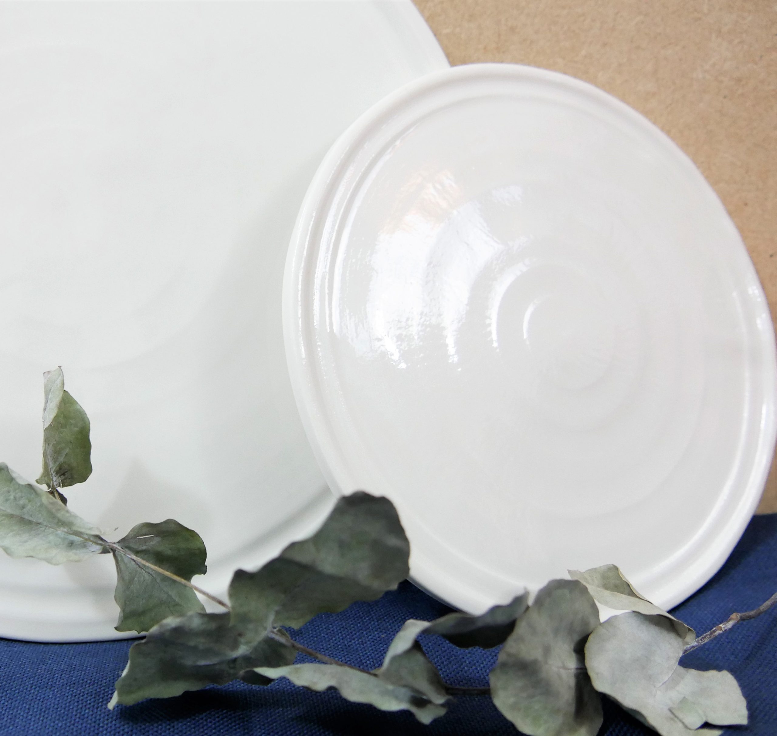 La légère irrégularité des bords de chaque assiette rend les pièces uniques et souligne le charme de la fabrication artisanale.