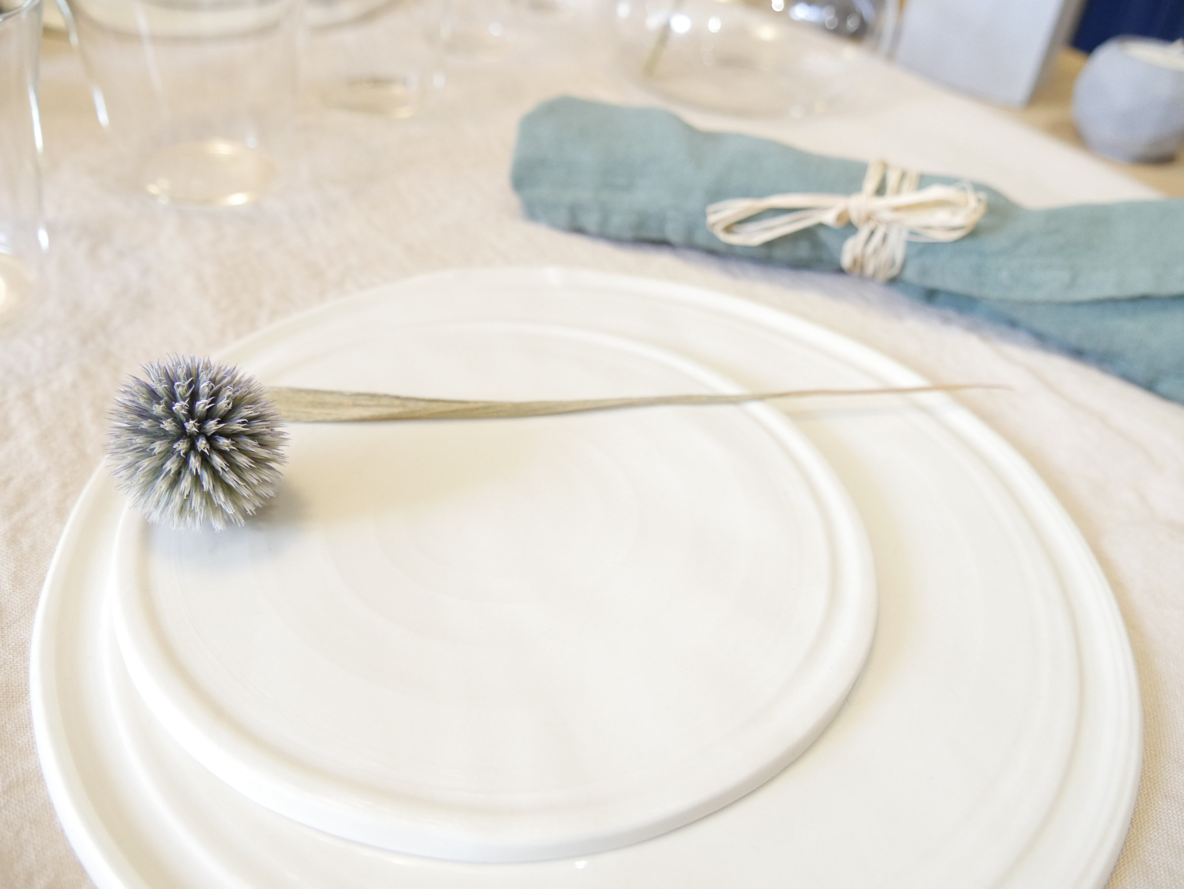 Superbes petites assiettes plates blanches jouant sur la sobriété, mais c’est bien là que l’on retrouve l’élégance intemporelle.