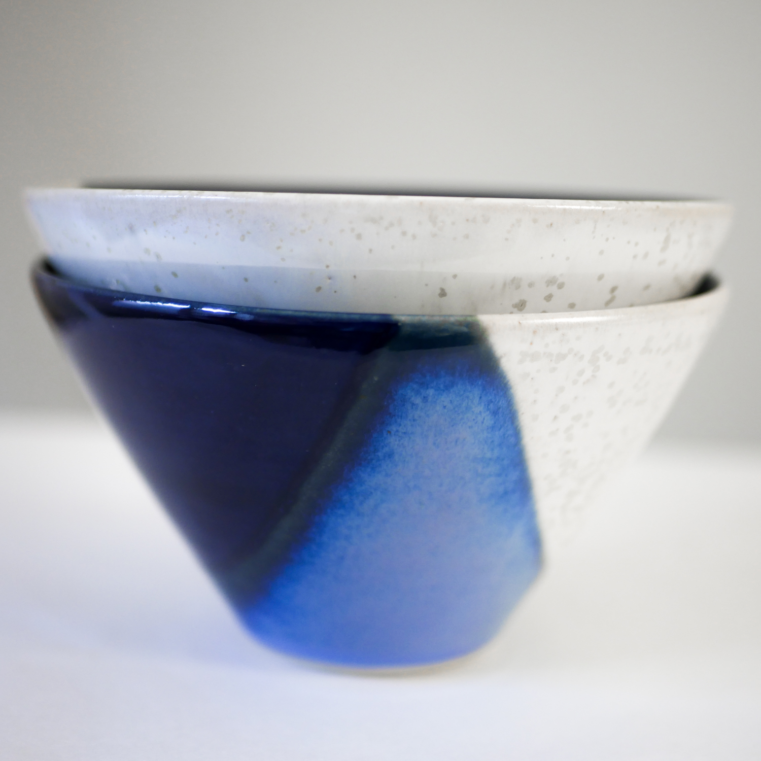 Très beau bol en céramique tourné et émaillé à la main, plait par sa forme légèrement conique et ses lignes de couleurs qui vont du bleu foncé au blanc, laissant apparaître subtilement la matière naturelle du grès.