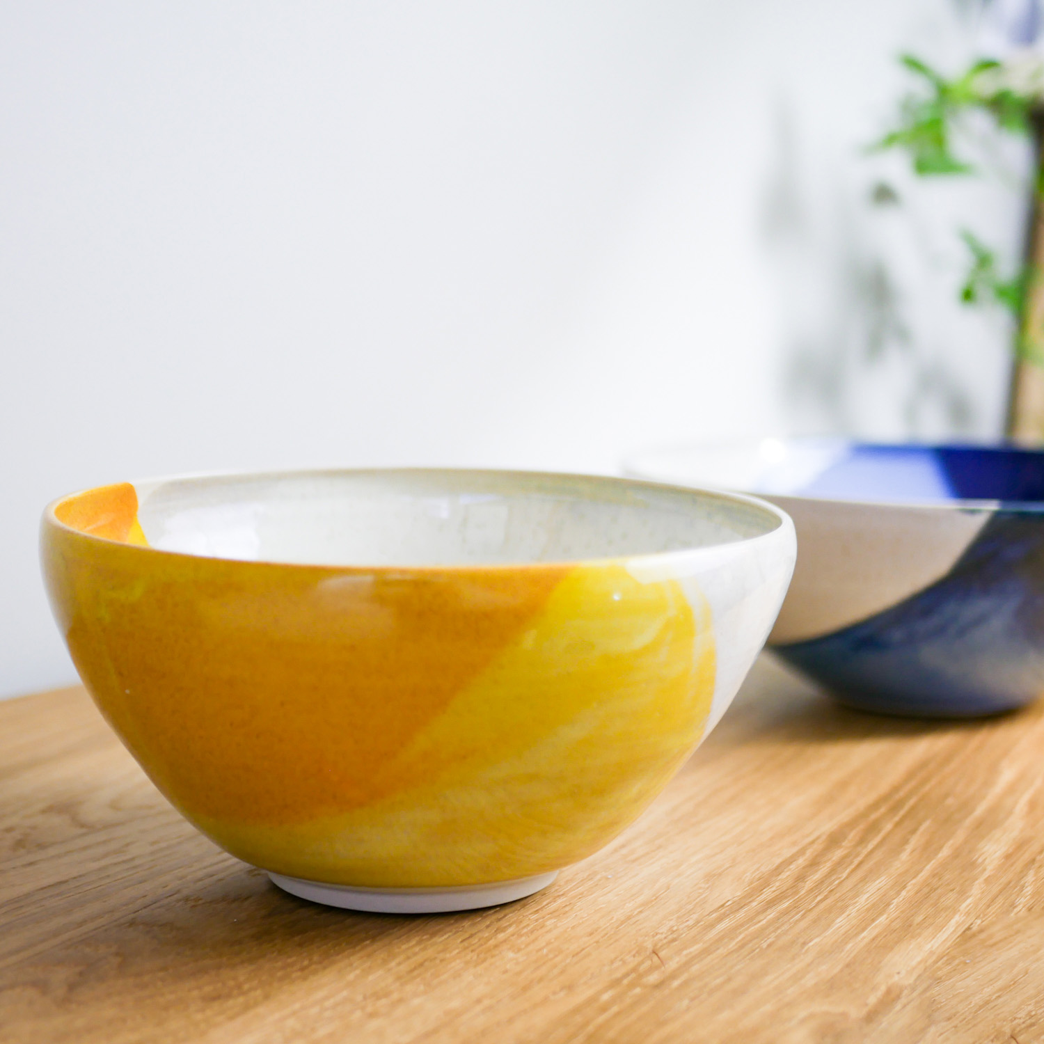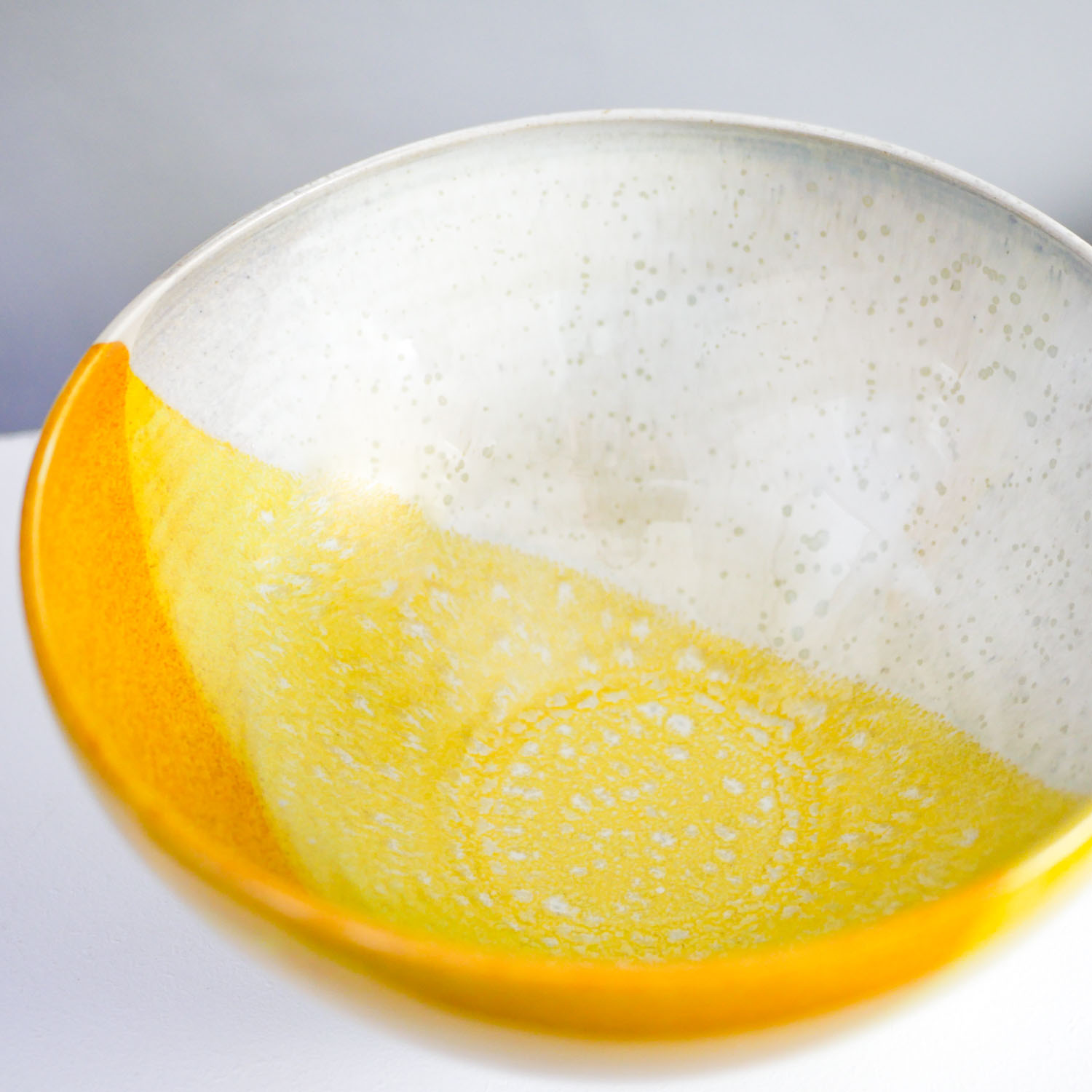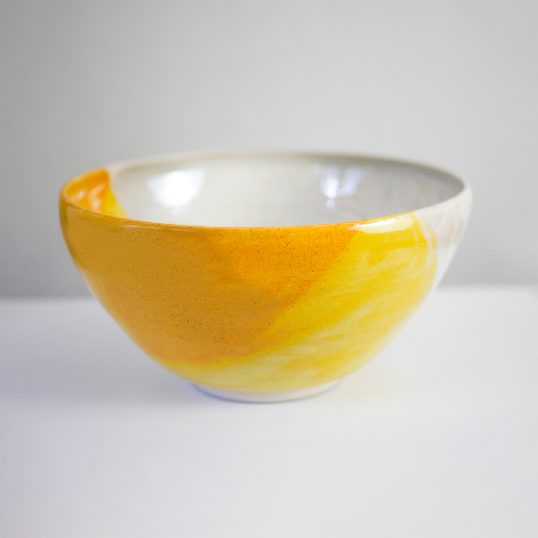 Ce saladier en grès jaune, aux couleurs d’été jaune orangé, jaune clair et blanc, est tourné et émaillé artisanalement en Bretagne. Il marque sa différence par une forme contemporaine et une technique d’émaillage qui lui donne un style graphique, frais et coloré.