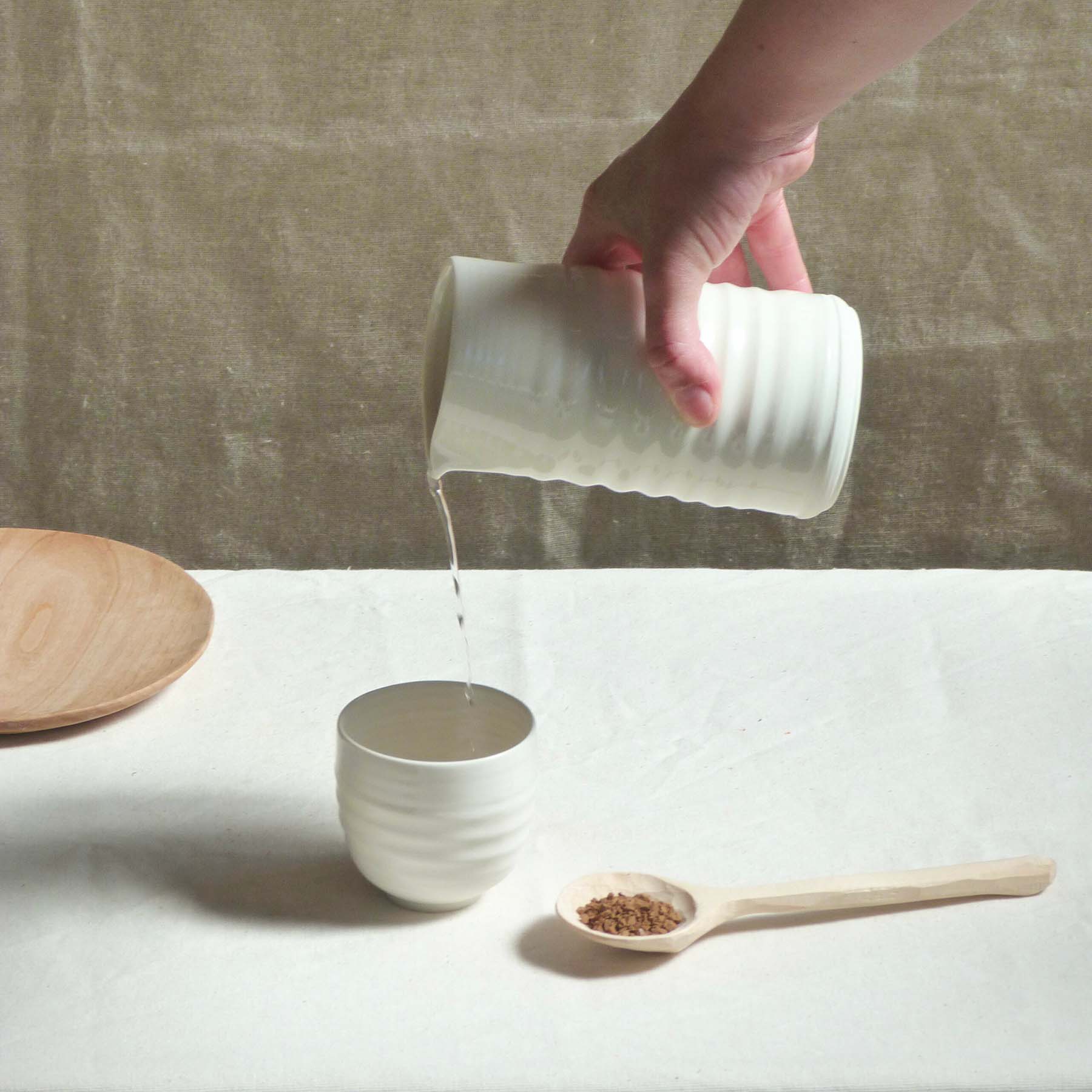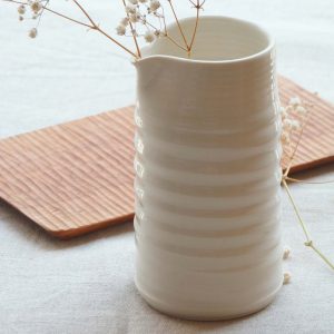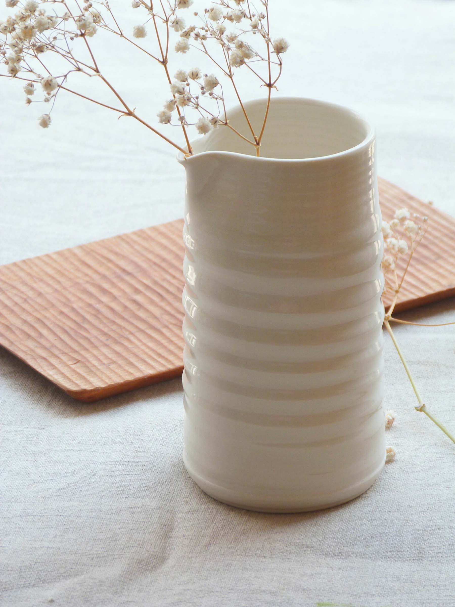 Le petit pichet Tornade au style épuré et à la couleur blanche immaculée est tourné à la main par Ambre, céramiste nantais de talent.