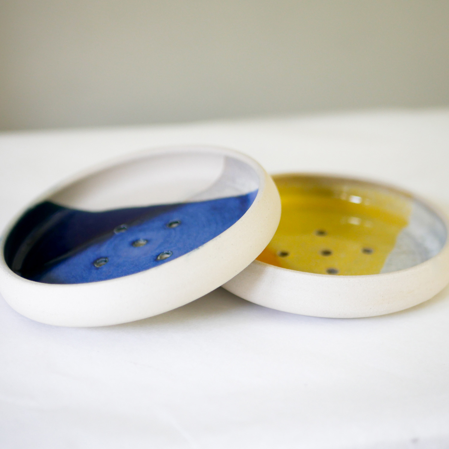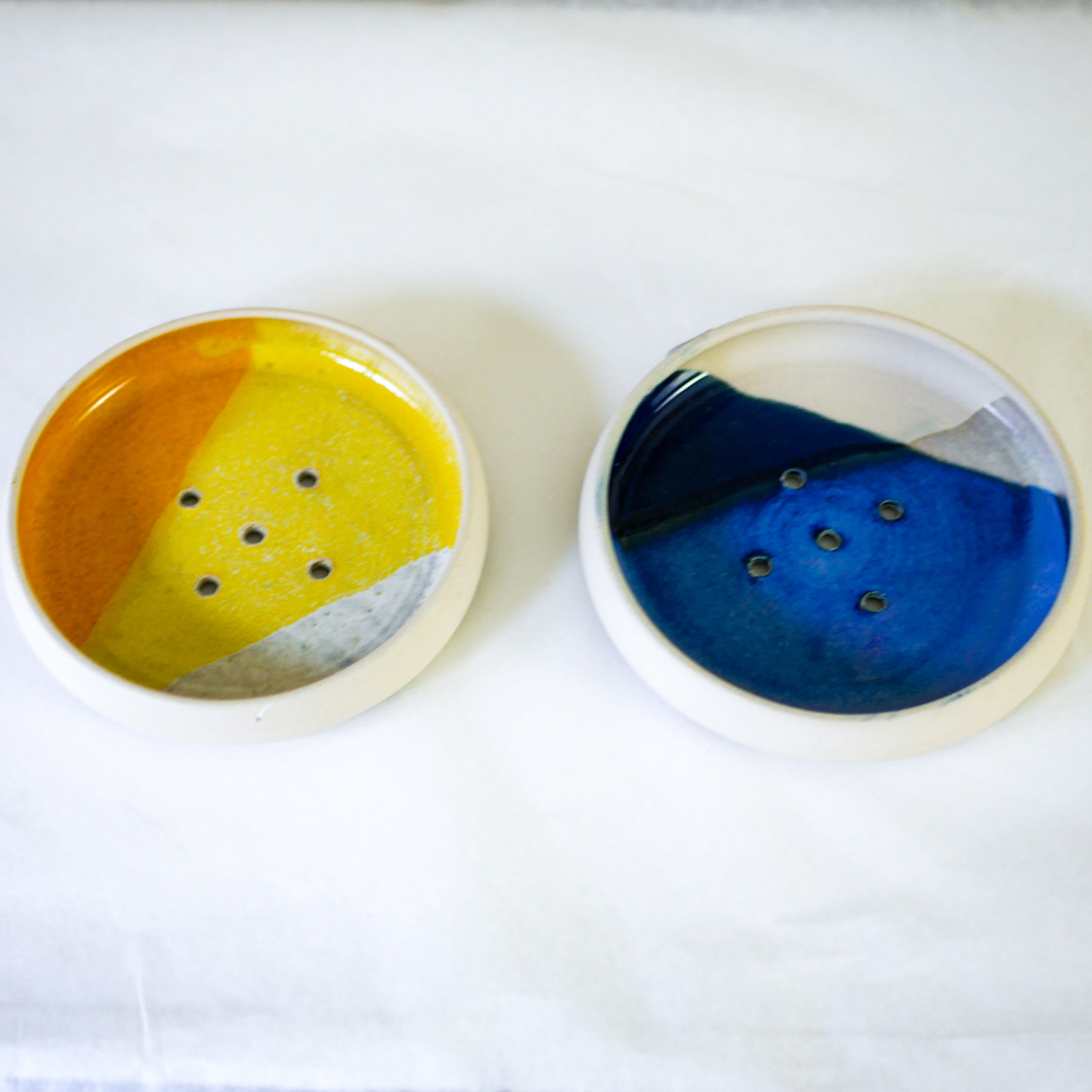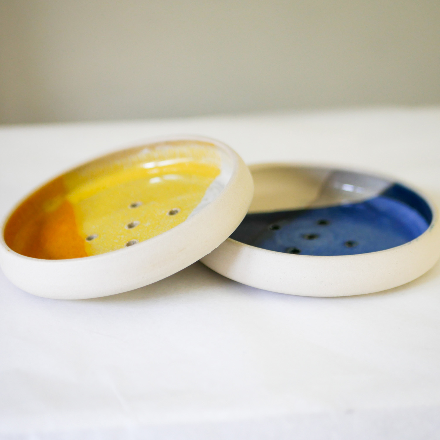 Ce porte-savon en céramique, tourné et émaillé à la main, se décline en deux coloris :  jaune ou bleu. C’est un accessoire pratique et esthétique, avec une finition soignée et des couleurs intemporelles. Il mesure 11 cm de diamètre et intègre des trous ainsi qu’une petite surélévation pour l’écoulement d’eau.