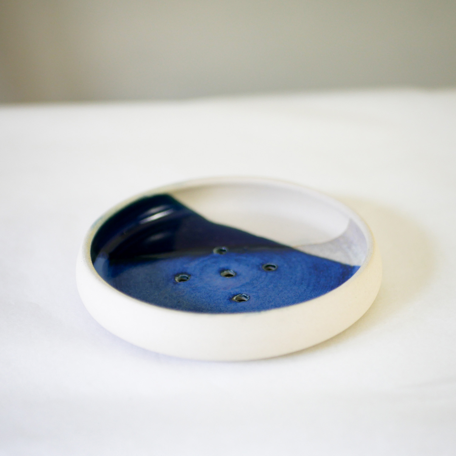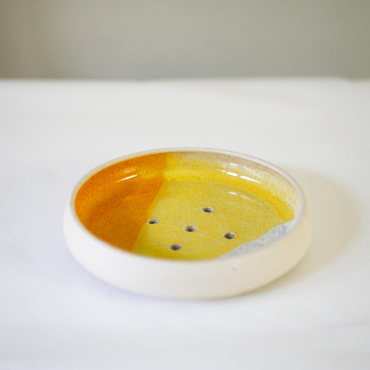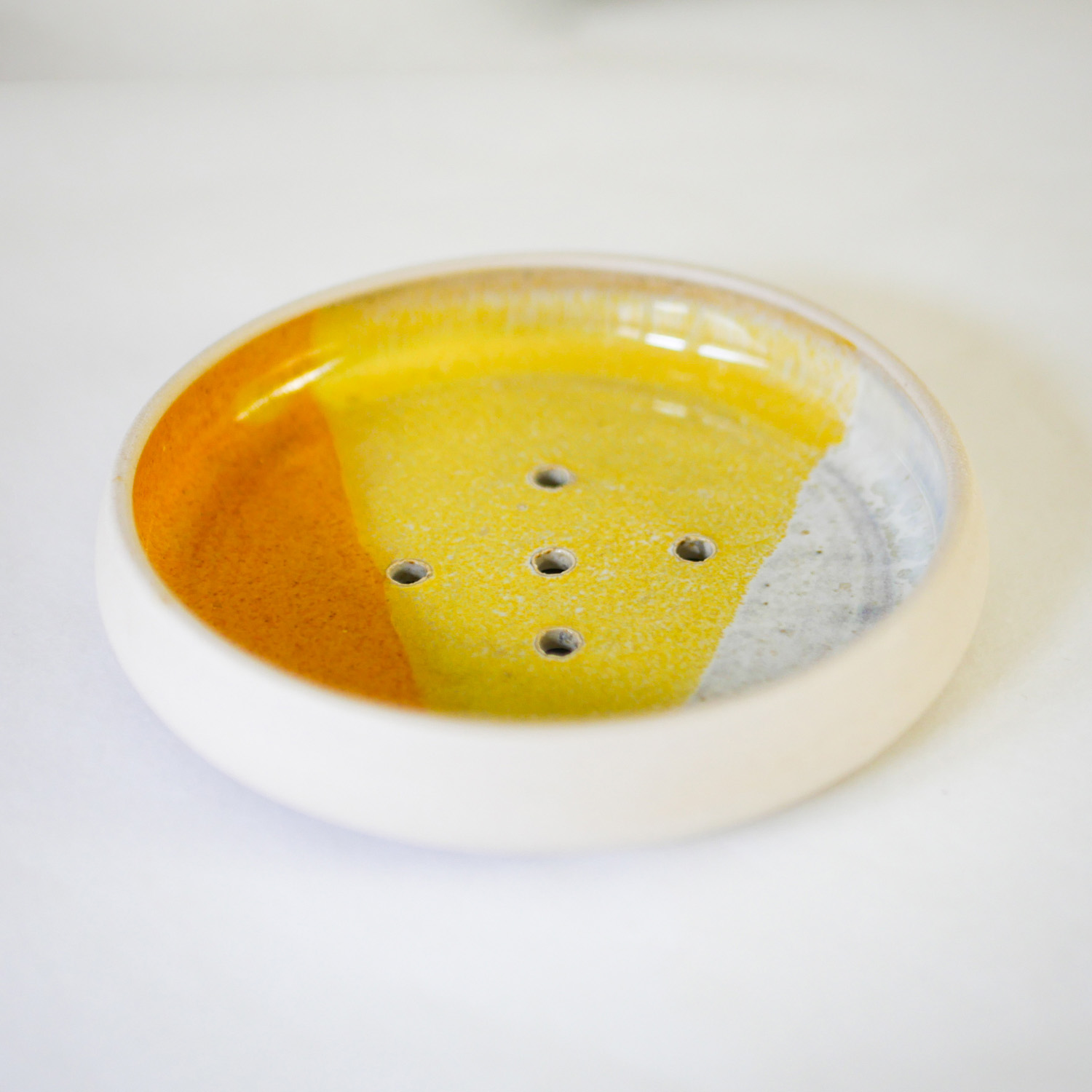 Ce porte-savon en céramique, tourné et émaillé à la main, se décline en deux coloris :  jaune ou bleu. C’est un accessoire pratique et esthétique, avec une finition soignée et des couleurs intemporelles. Il mesure 11 cm de diamètre et intègre des trous ainsi qu’une petite surélévation pour l’écoulement d’eau.