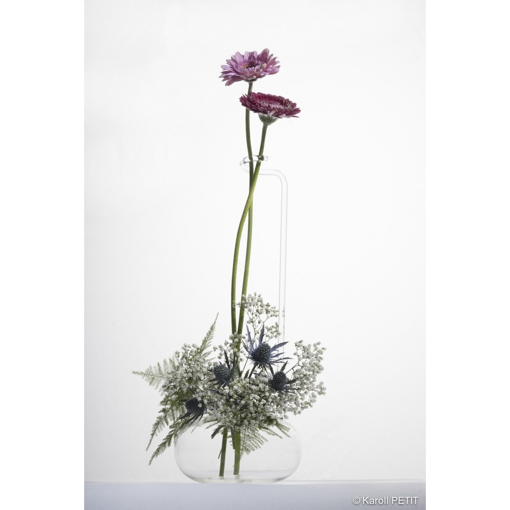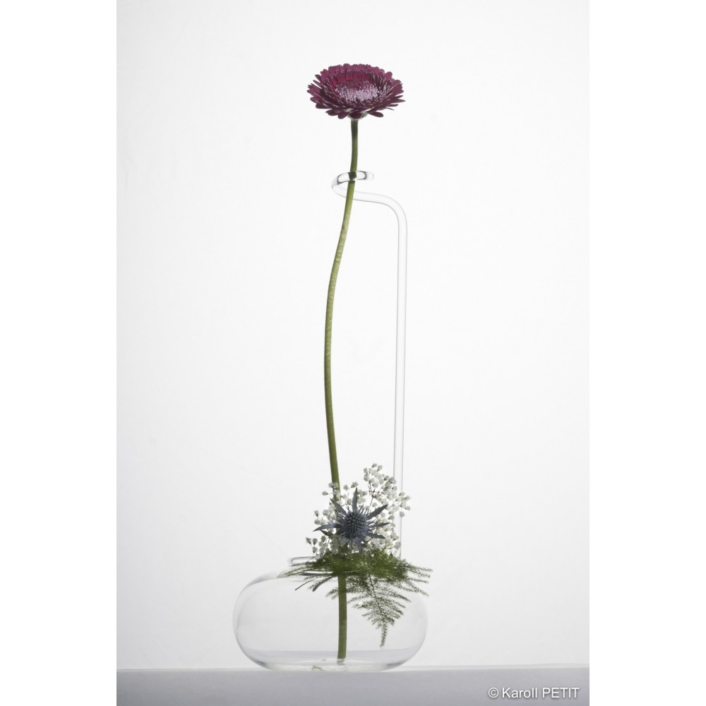 Entre vase et soliflore, cette belle pièce en verre soufflé au tuteur intégré, offre une présentation pour une composition florale très élégante et toute en légèreté.
