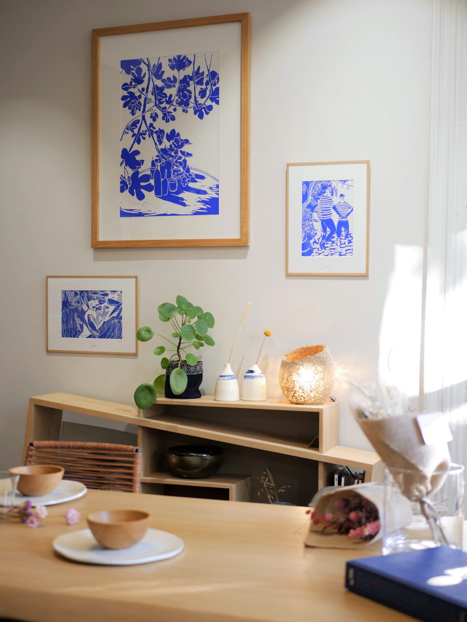 La linogravure? Il s’agit d’une technique de gravure sur plaque de linoleum, à partir de laquelle, après application d’une encre bleue, des impressions sont tirées.