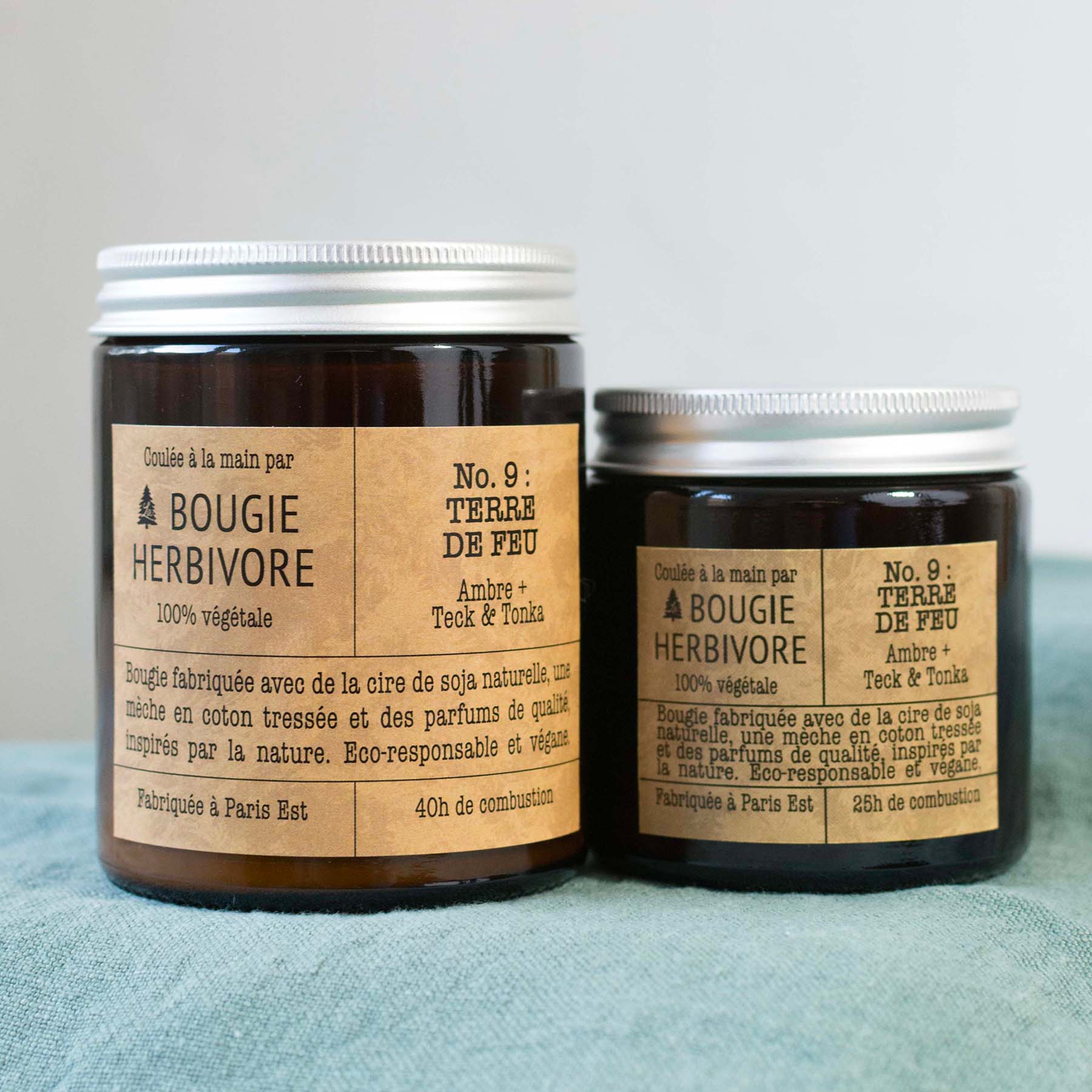 Les bougies de la maison « »La Bougie Herbivore » » sont fabriquées à la main avec de la cire de soja naturelle pour une combustion saine. Elles sont conçues avec une mèche sans plomb en coton tressé, et des parfums de Grasse sélectionnés avec soin.