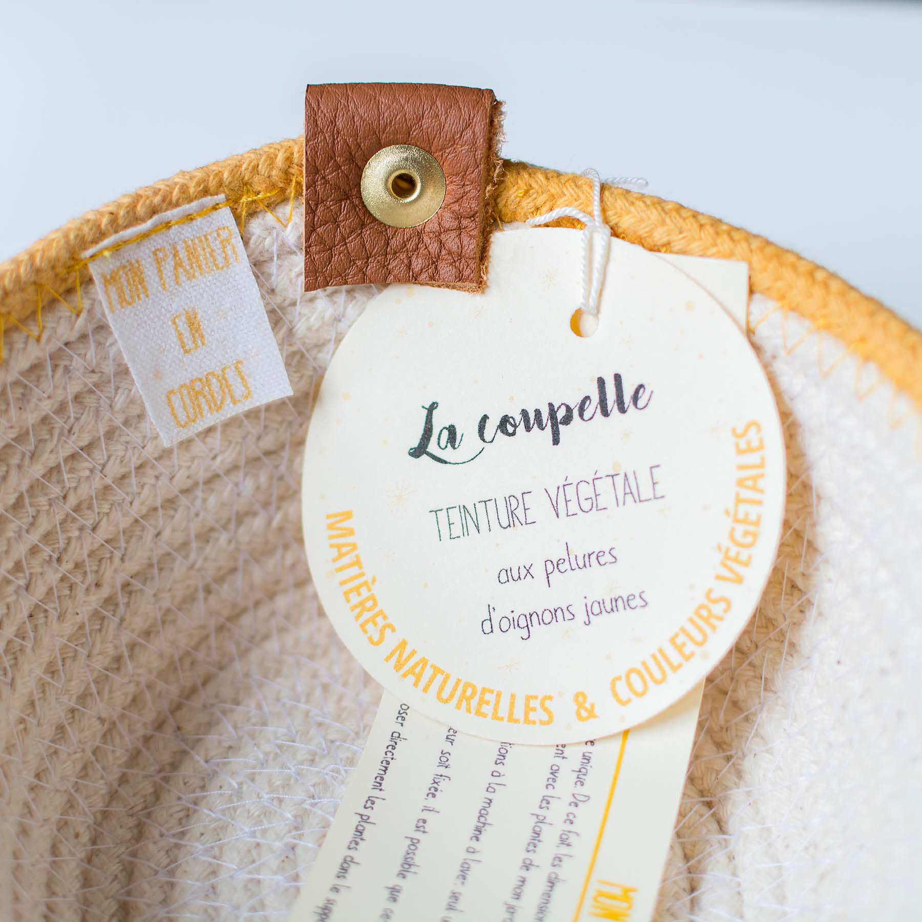 Les créations de « Mon panier en cordes », sont uniques ou réalisées en petite série. Les matières utilisées sont 100 % végétales tout comme les couleurs qui proviennent de plantes cueillies dans la nature, cultivées au jardin de plantes tinctoriales ou achetées. Le procédé de teinture végétale est très ancien et garanti donc un processus respectueux de l’environnement et des couleurs résistantes aux UV et à l’eau.