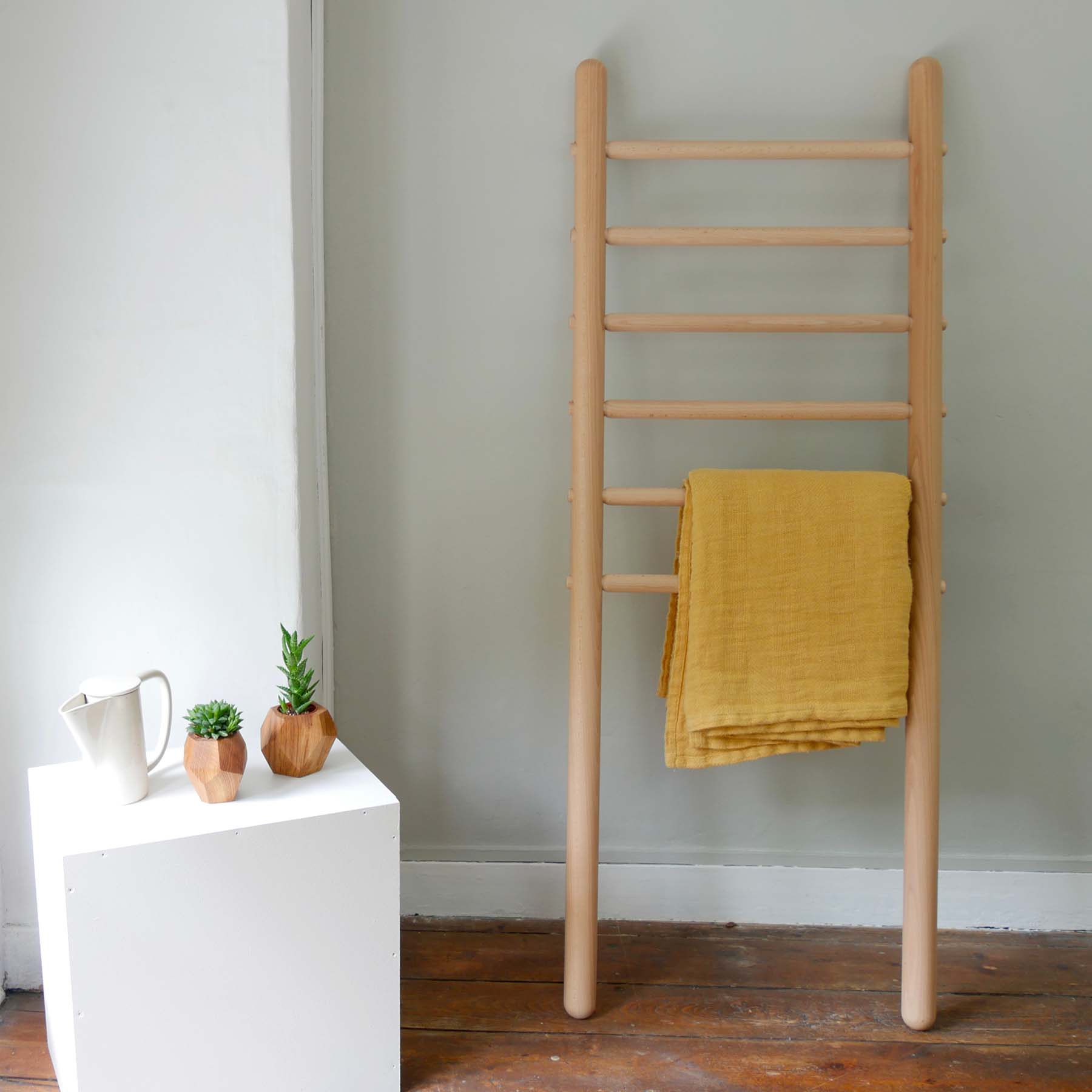 Cette jolie échelle en bois allie utilité pratique et esthétisme. Parfaite pour aménager une salle de bain, cette création signée Virginie Lobrot s’intègre à tous les styles de décoration.