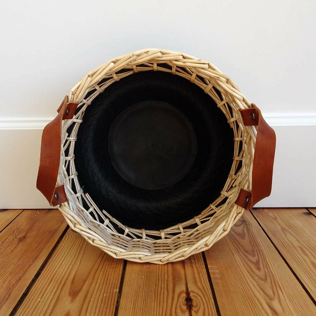 Panier en osier blanc écorcé avec une base de caoutchouc et des anses en cuir. Ce sont des créations artisanales uniques ou de mini-série.