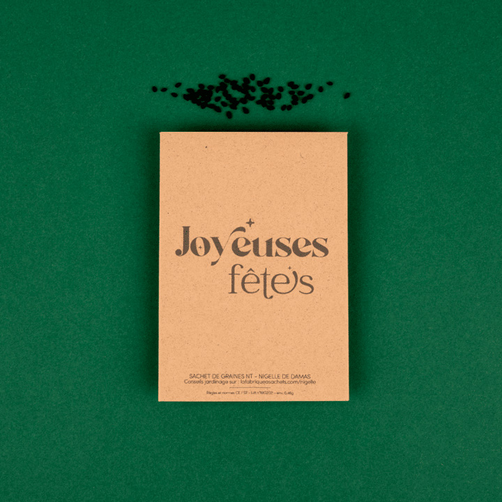 Votre petite attention de Noël se compose seulement de 3 éléments : du papier kraft recyclé, de l’encre végétale et des graines de nigelle de Damas françaises. Elle est imprimée avec la plus grande attention dans l’atelier de production nantais de la Fabrique à sachets.