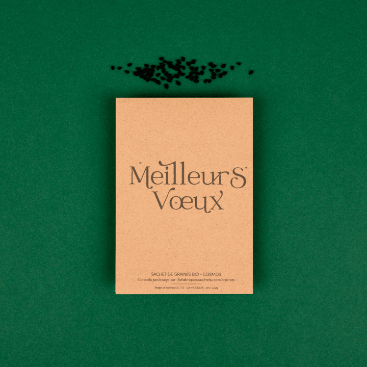 Cette carte souhaitant les «  »Meilleurs vœux » » contient des graines de cosmos françaises, reproductibles et mellifères. La carte sachet en kraft, est fabriquée à Nantes à partir de poudre de coques de cacao.