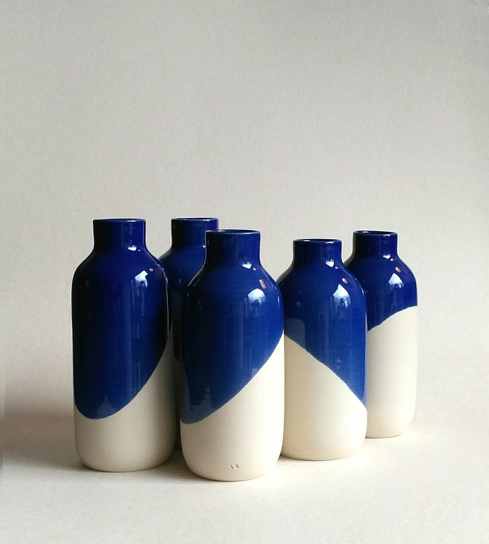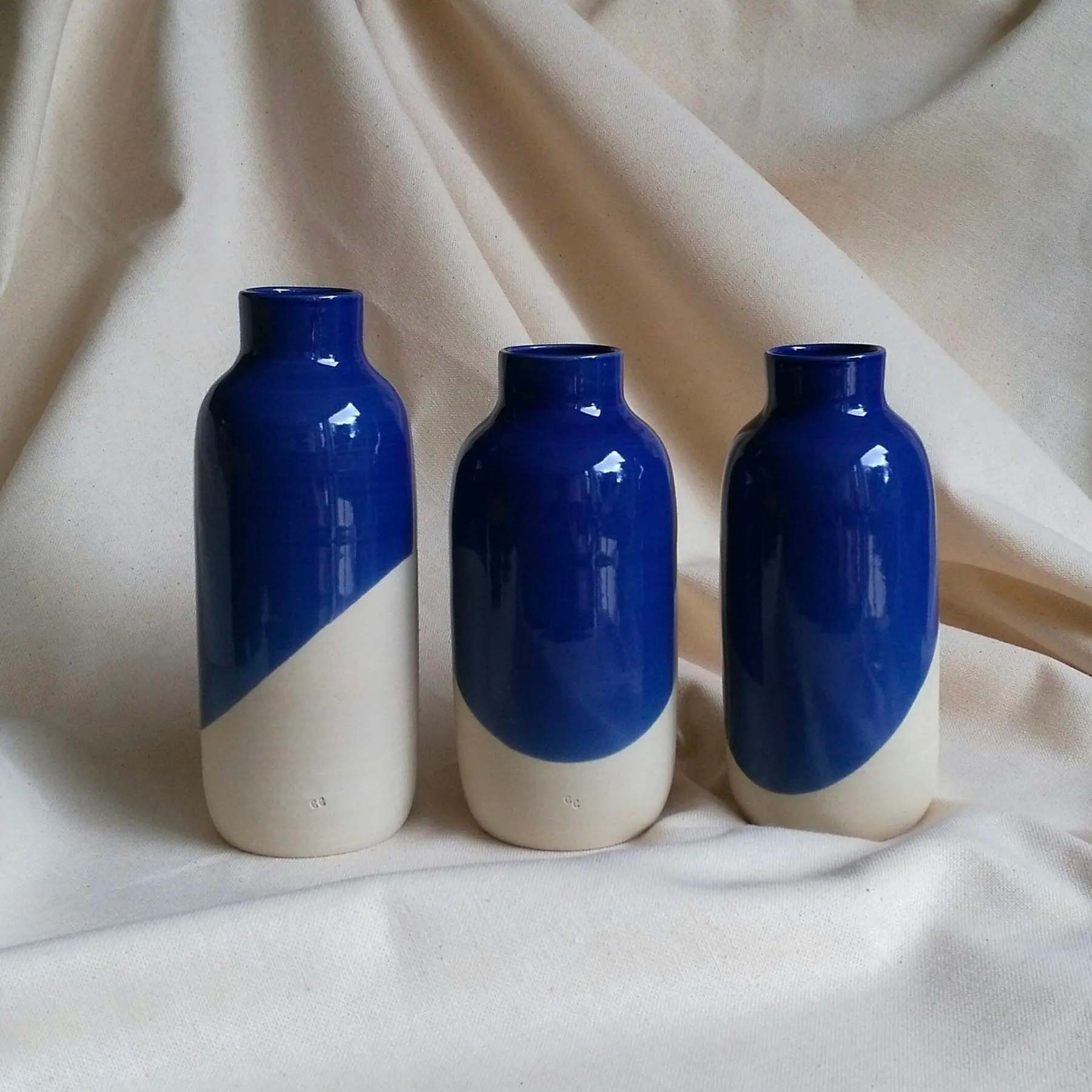 Vase en grès blanc et émail bleu, en forme de bouteille. Idéals pour les petits bouquets de printemps.