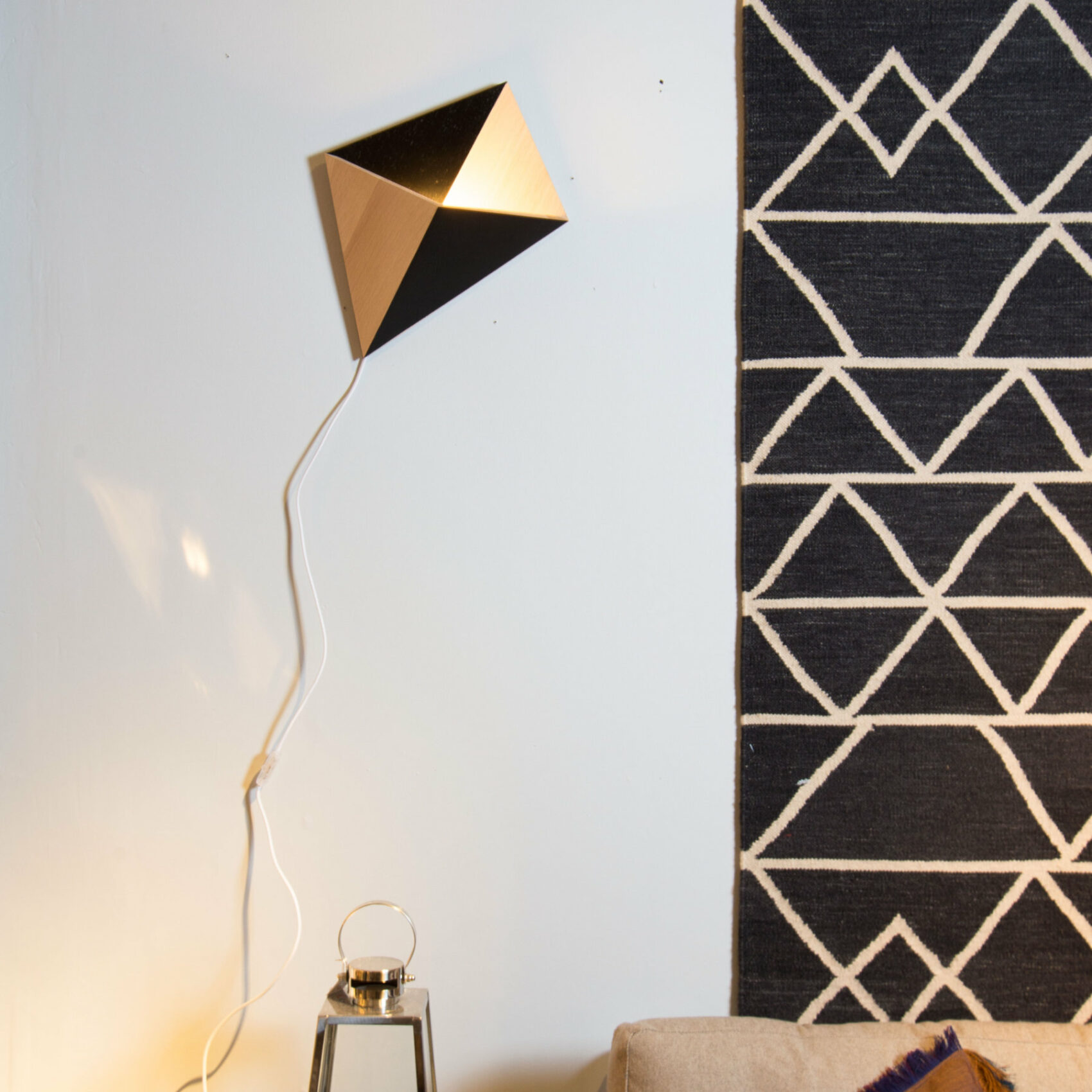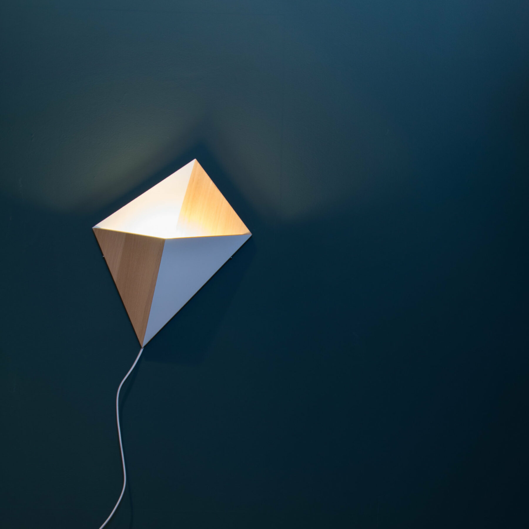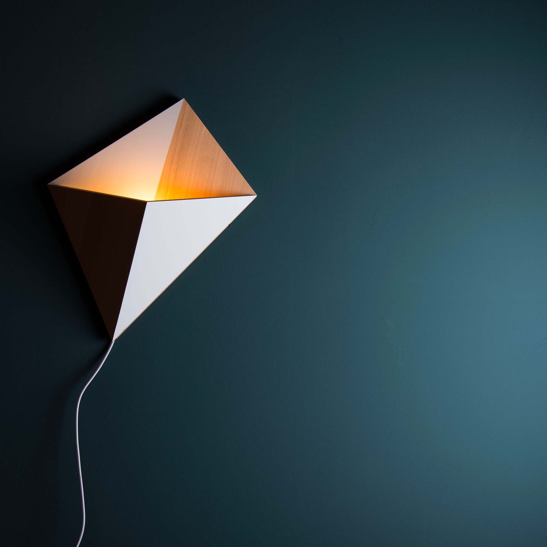 Applique murale en bois de chêne issu de forêts françaises gérées durablement. Cette applique en forme de cerf-volant diffuse une lumière indirecte chaleureuse aux reflets colorés.
