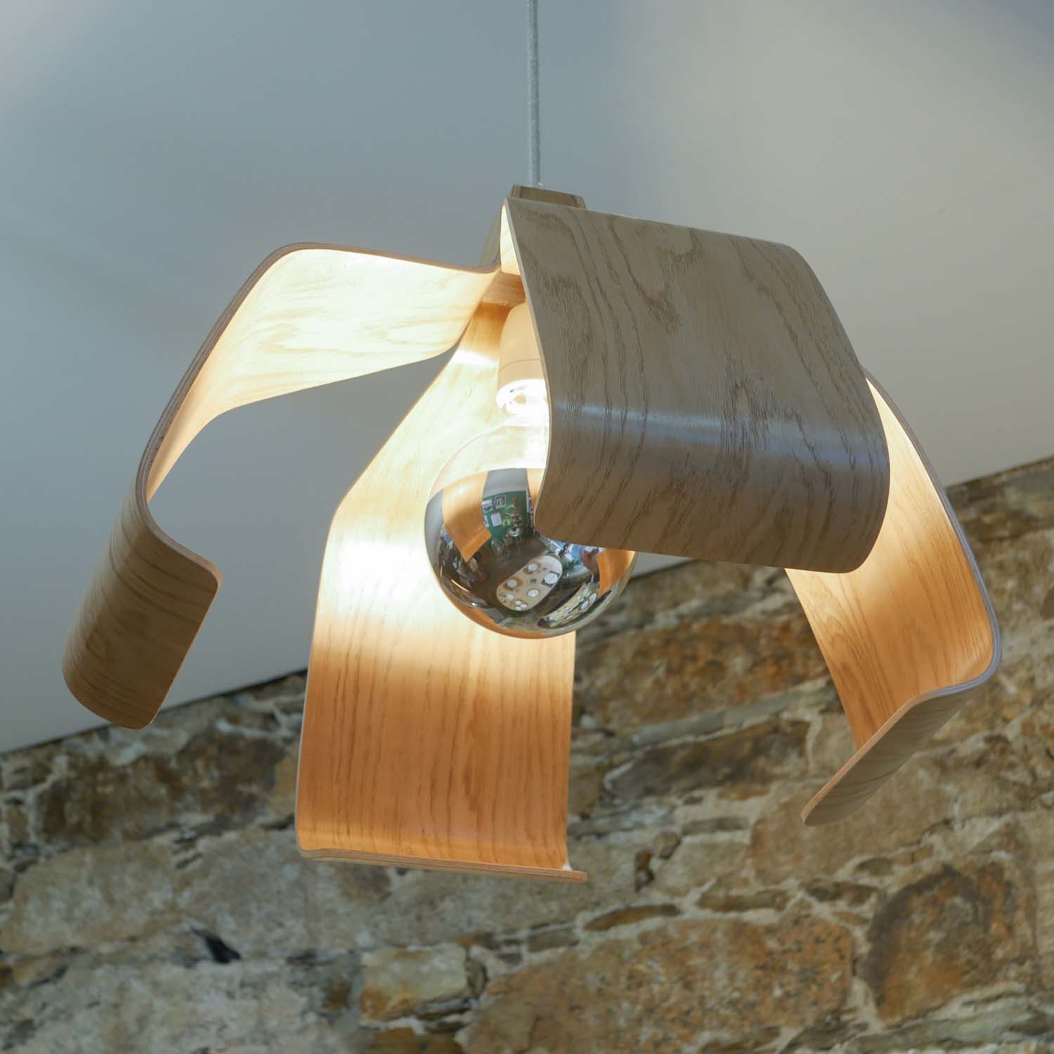 On aime particulièrement les courbes formées par le bois, qui entourent subtilement l’ampoule.