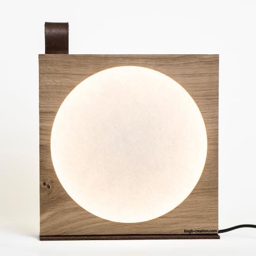 Le corps de la lampe à poser Moon KNGB est est réalisée avec des déchets de bois de chêne issus de la découpe des disques destinés aux suspensions de la même marque.
