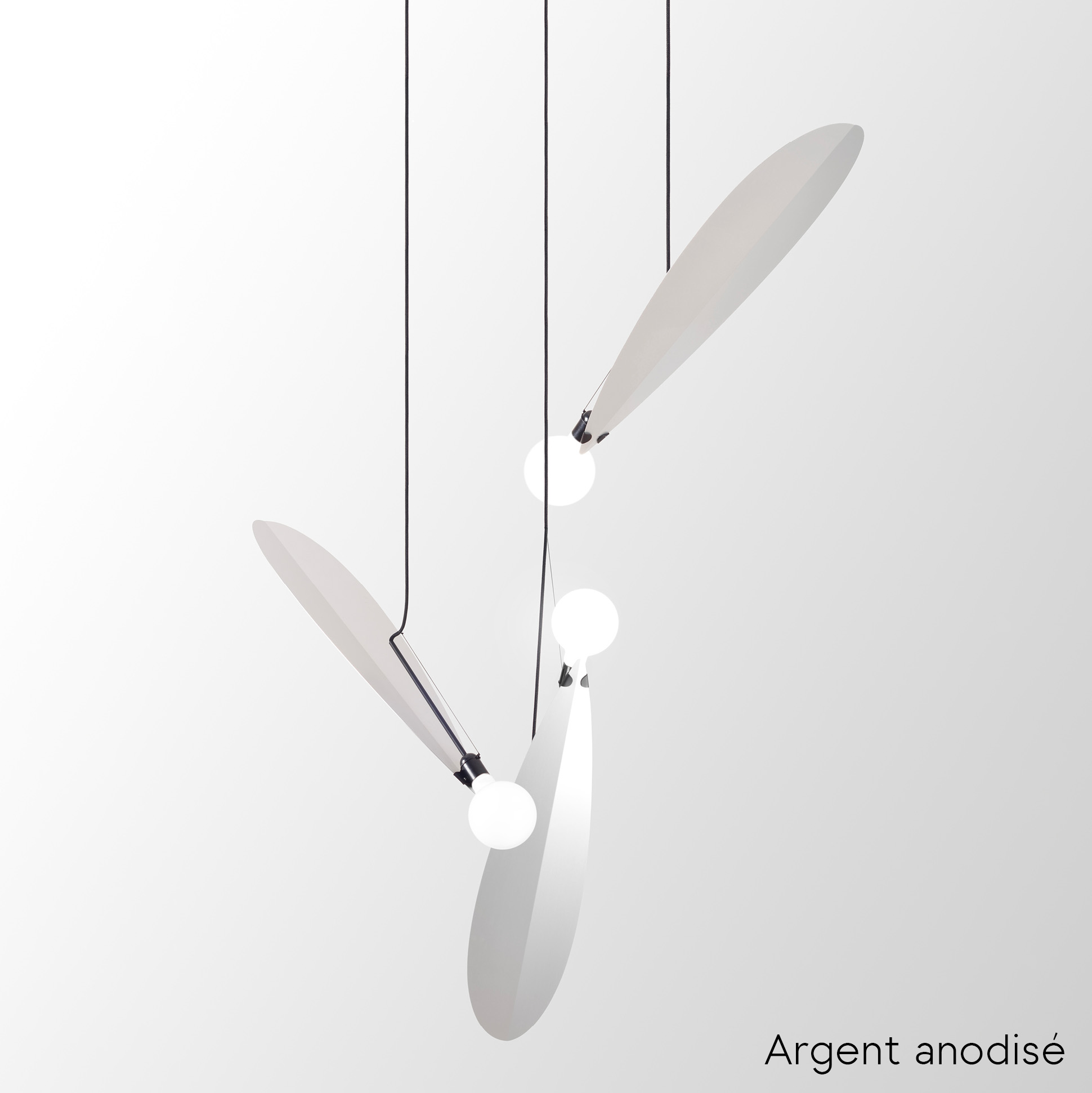 La suspension Samare est composée de 2 câbles : le câble d’alimentation, qui suspend l’ensemble, et un câble mobile qui permet l’inclinaison à 180°. Ainsi, vous pouvez disposer la suspension à votre guise. Idéal dans une descente d’escalier ou espace avec de la hauteur sous plafond important afin de jouer sur les inclinaisons et pouvoir créer un ensemble. La partie colorée est métallique et disponible en Argent et Or cuivré.
