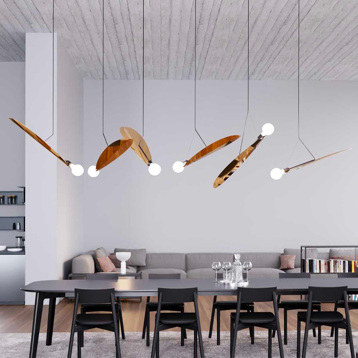 Samare est une suspension en longueur dont la forme s’inspire du fruit de l’érable. Graine qui tombe en tournoyant depuis son arbre et voyage au gré des vents. Sa forme allongée lui apporte de l’élégance et habille le volume d’une pièce ou d’un escalier de manière gracieuse.