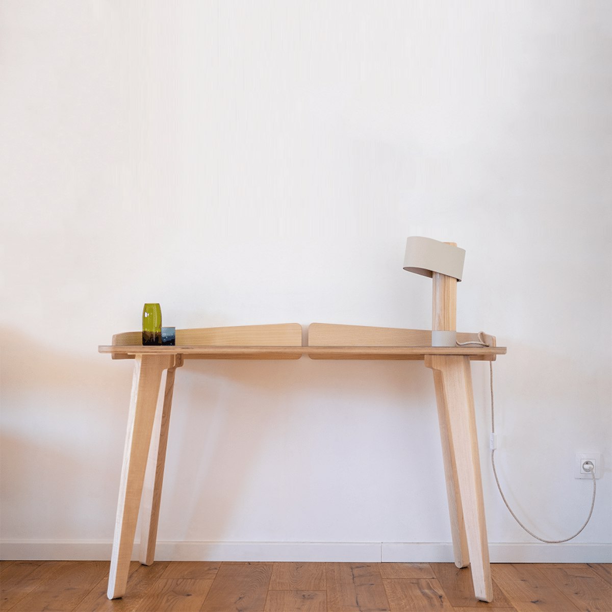 Nous aimons la forme du bureau intelligemment pensée avec ses deux réhausses multiplis frêne (pour retenir les objets et stylos sur le plateau) et un passe câble central qui viennent compléter sa ligne et sa fonctionnalité.