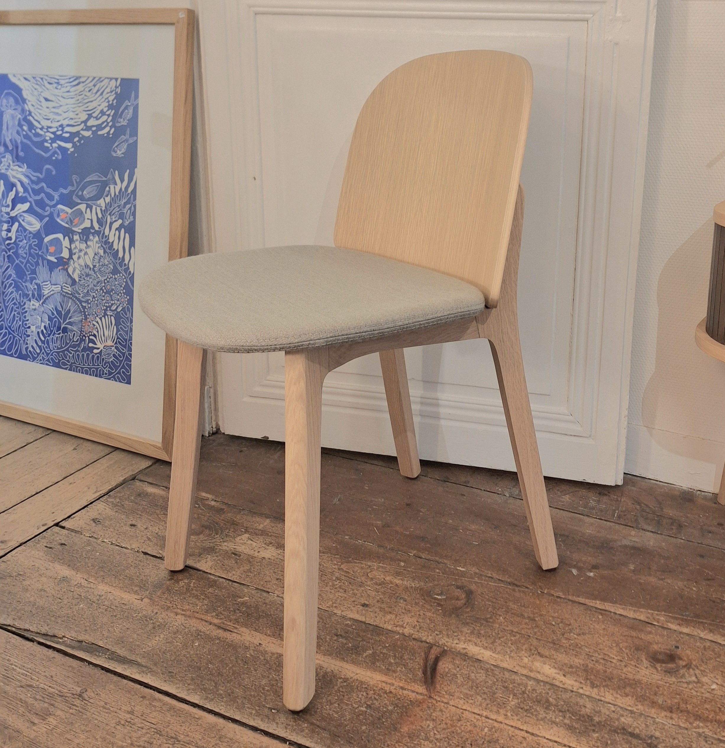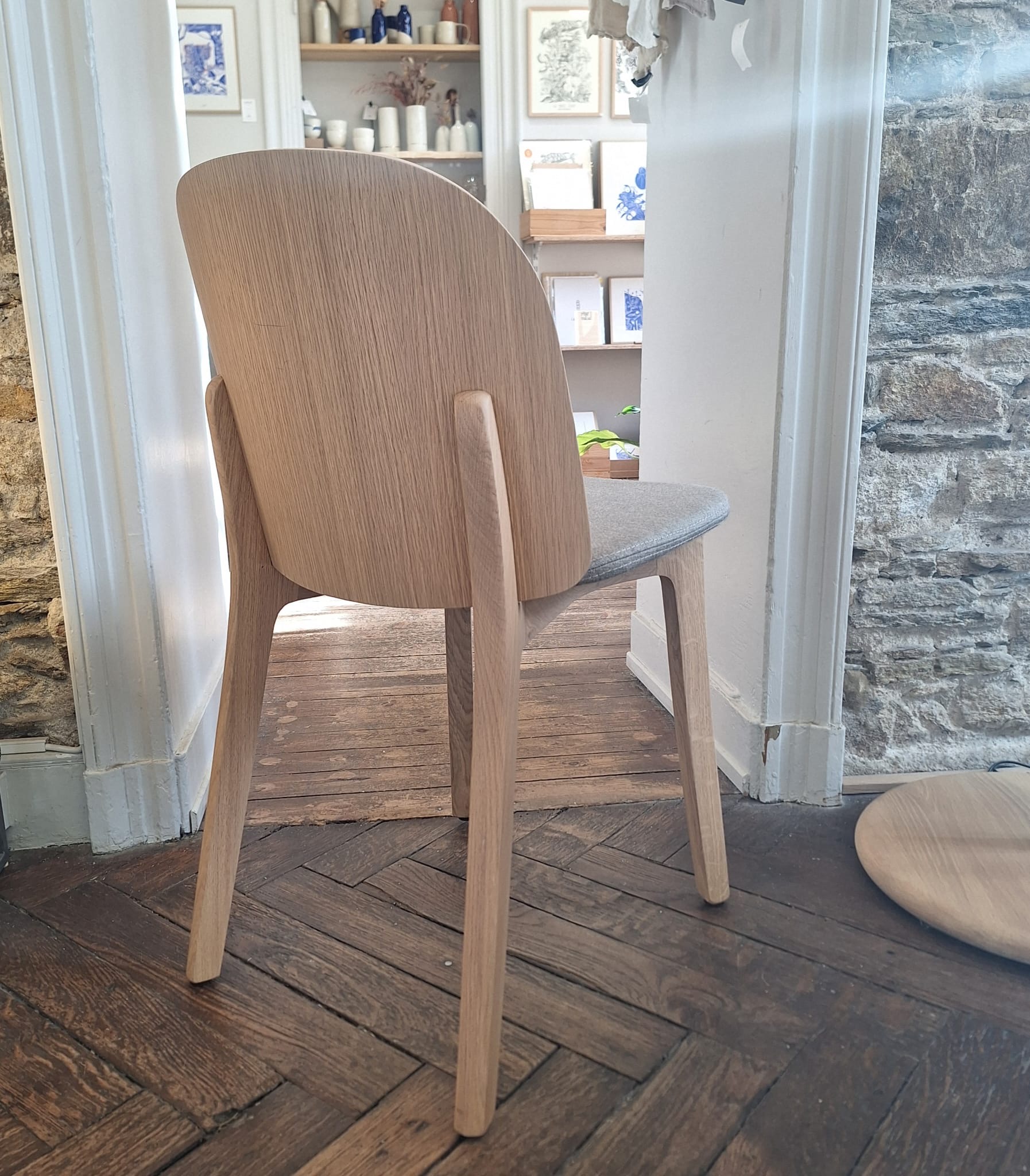 Cette chaise en bois tapissée Lanas, aux lignes épurées, est le résultat d’un travail de conception et de réalisation méticuleux. Les courbes de l’assise et du dossier reflètent un savoir-faire exceptionnel, offrant un grand confort grâce à la forme enveloppante du dossier qui épouse parfaitement les contours du corps.