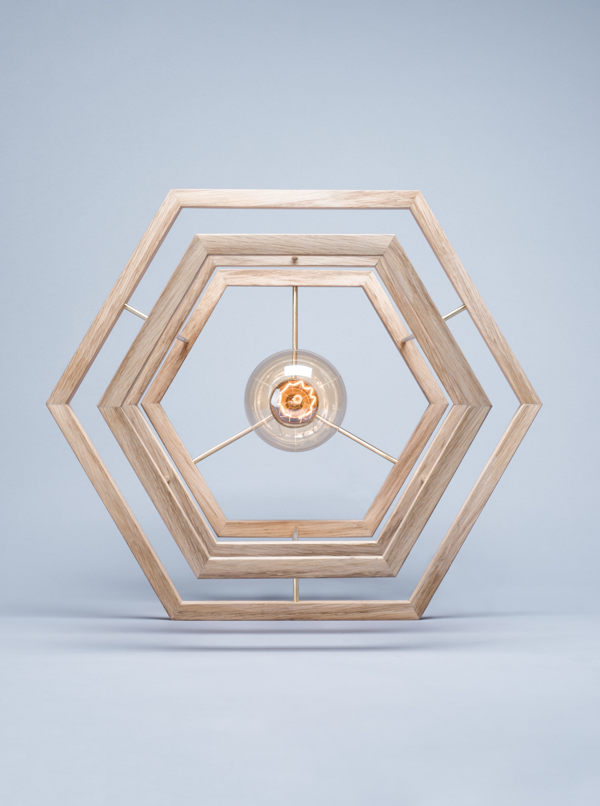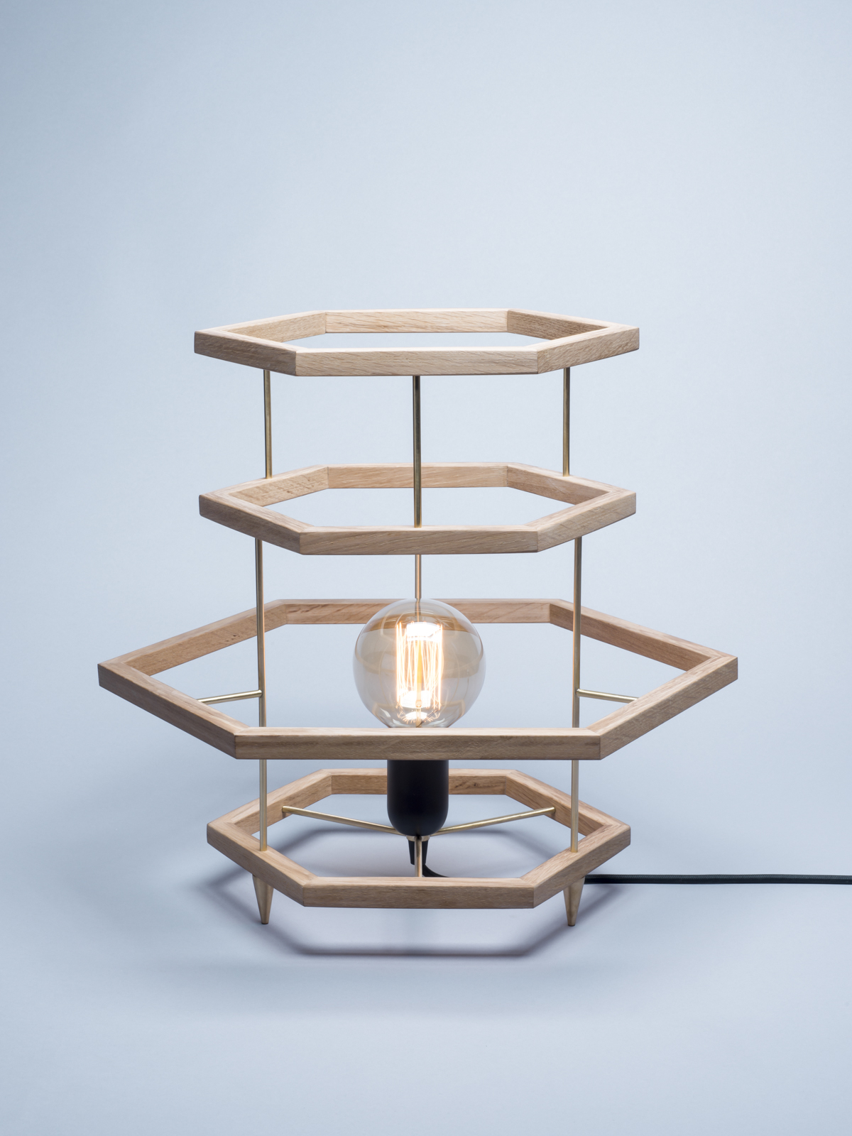 Des formes géométriques en chênes soutenues par de fins montants en laiton laissent apparaître une ampoule à filament vintage.