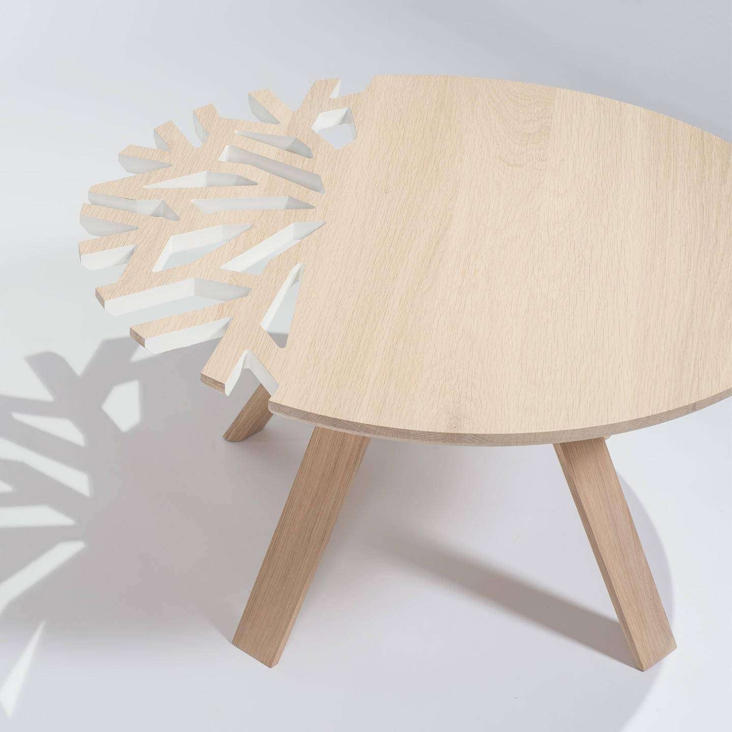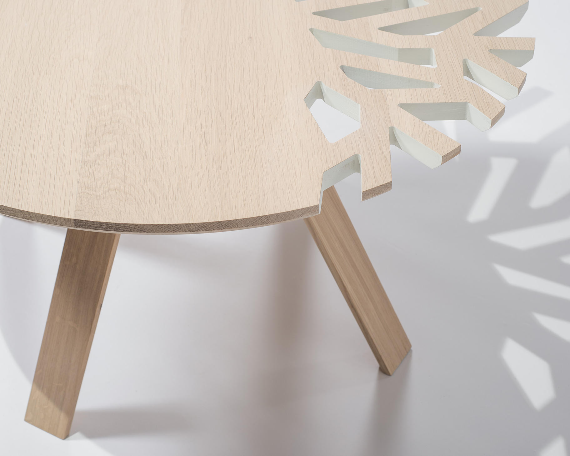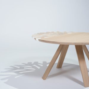 Une table basse naturelle en chêne massif ajourée qui inspire la forêt et ses jeux lumière. fabriquée à la commande.