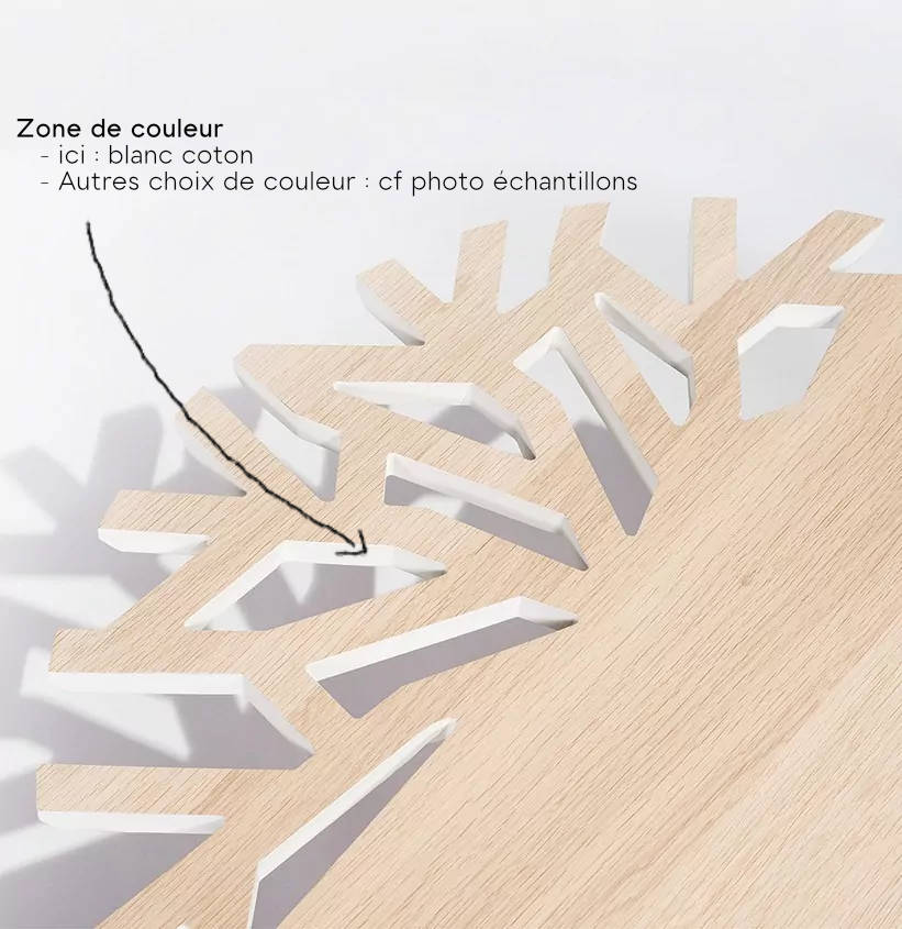 Conçue en chêne 100 % massif issu de forêts françaises gérées durablement, elle bénéficie d’une finition vernis mat qui sublime son authenticité. La couleur des découpes est personnalisable, et un plateau en verre de 5 mm d’épaisseur est disponible en option. Chaque pièce est fabriquée avec soin en Anjou, garantissant un caractère unique et respectueux de l’environnement.