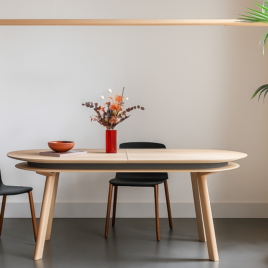 PARATI est une table ovale extensible, en chêne massif, fabriquée artisanalement en France.