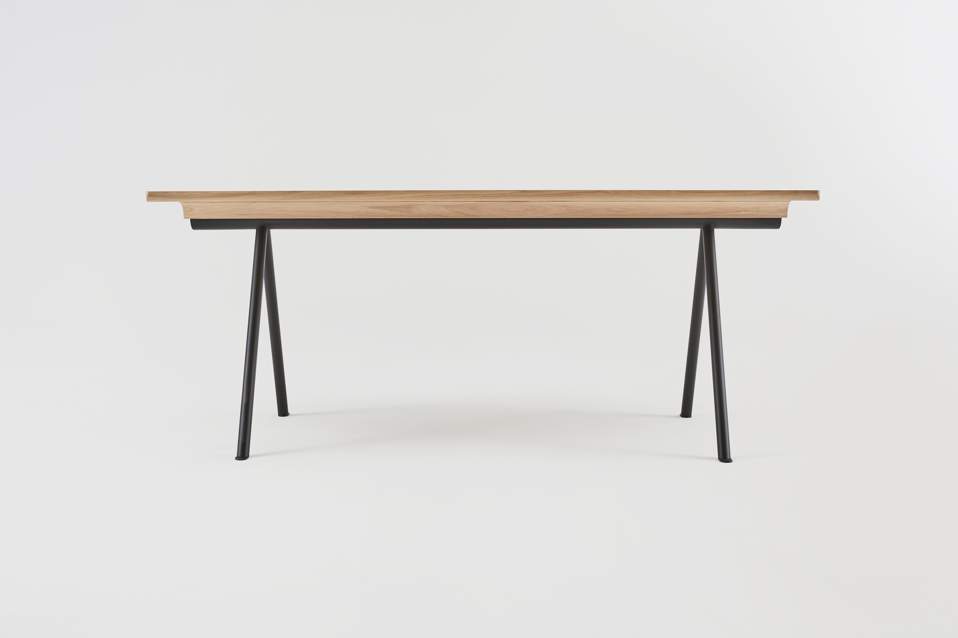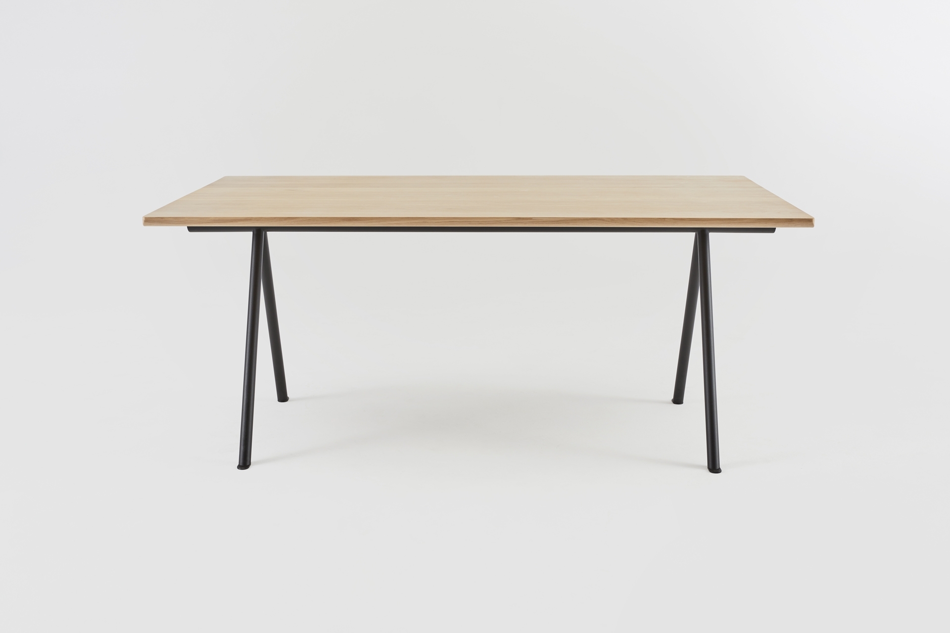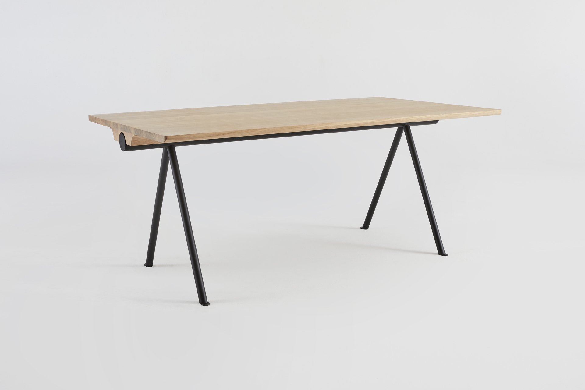 Table au design inspiré du monde de l’aviation. TARMAK est une table au dessin aérien et équilibré. Fin mélange entre lignes pures et robustesse, son plateau en chêne massif est porté par un tube central et des pieds inclinés en acier noir texturé.